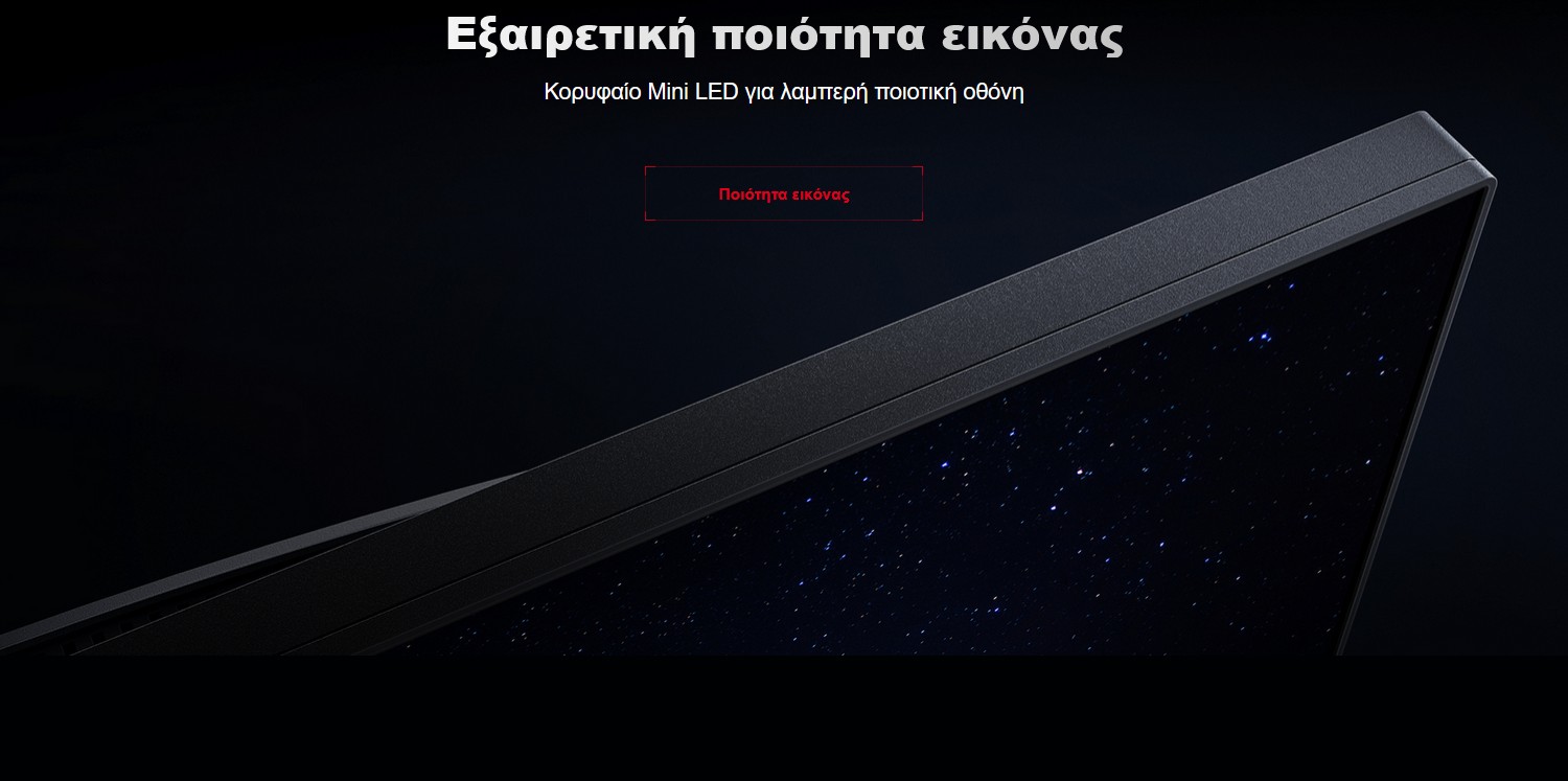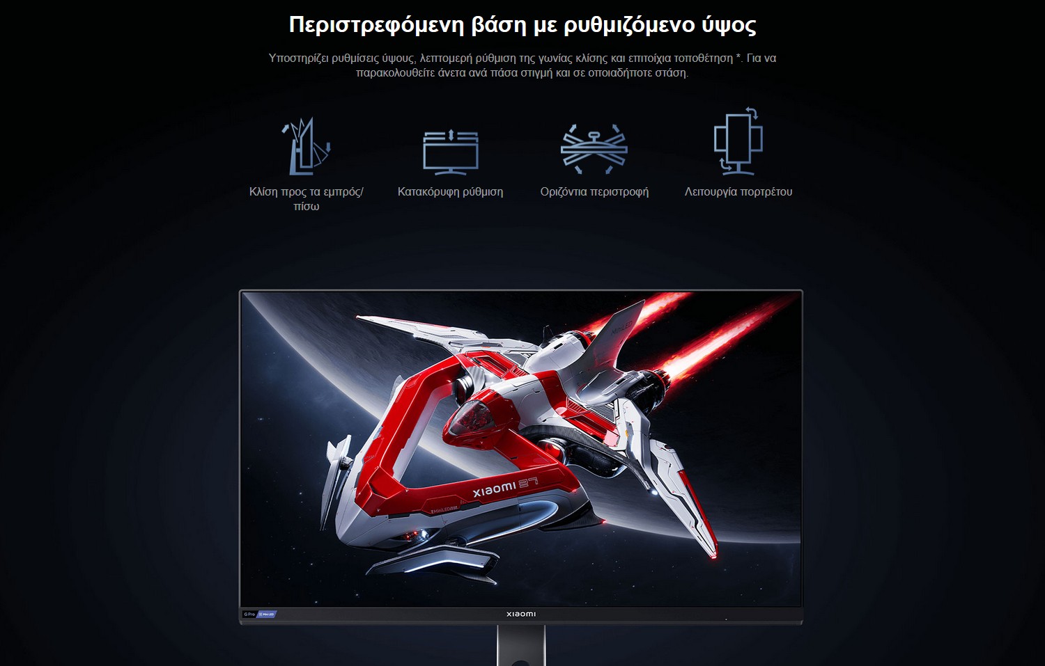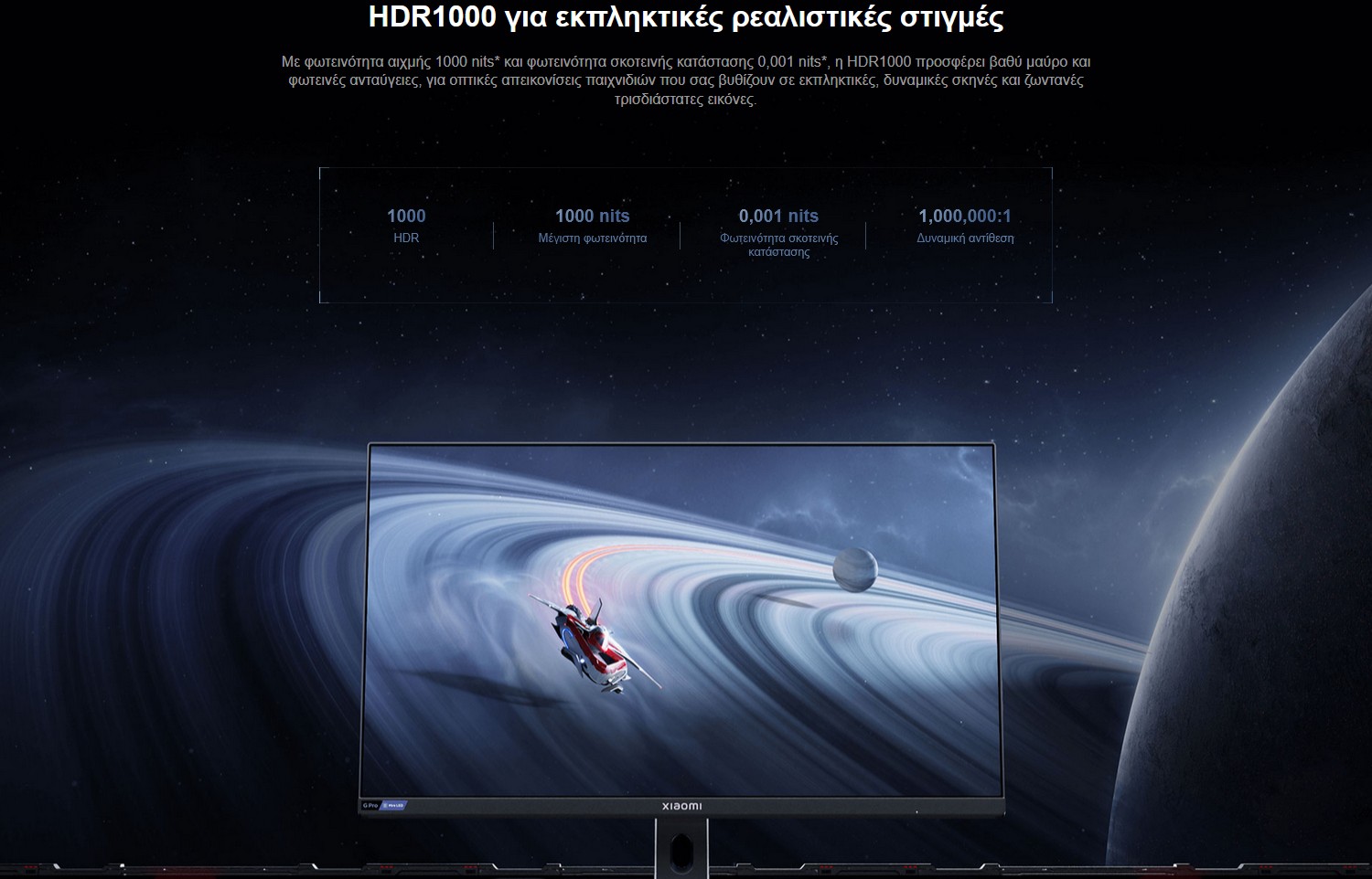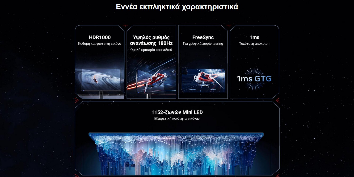 Το Gaming Monitor της Xiaomi διαθέτει Fast IPS πάνελ 27 ιντσών με ανάλυση 2K (2560 x 1440). Διαθέτει ρυθμό ανανέωσης 180Hz και χρόνο απόκρισης 1ms, το οποίο βοηθά στη μείωση του θαμπώματος κίνησης και των ghosting, καθιστώντας την οθόνη κατάλληλη για όλα τα παιχνίδια δράσης. Η οθόνη χρησιμοποιεί την τεχνολογία MiniLED με 1152 ελεγχόμενες ζώνες, παρέχοντας φωτεινότητα έως 1000 nits. Αυτό έχει ως αποτέλεσμα να παρουσιάζει βαθύ μαύρο και ζωντανά χρώματα. Διαθέτει HDR1000 και τεχνολογία FreeSync για να αποτρέψει το Tearing της οθόνης για μια πιο ομαλή εμπειρία παιχνιδιού.