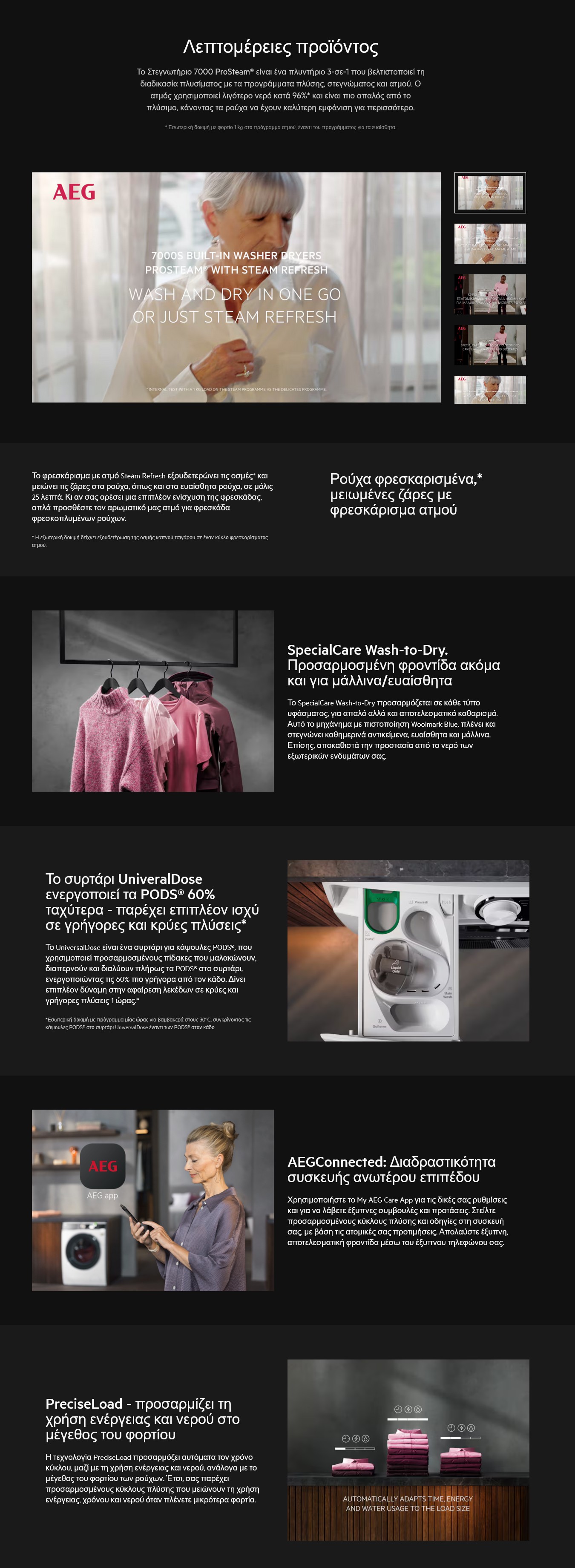 Πλύσιμο και στέγνωμα με τη μία. Ή απλό φρεσκάρισμα με ατμό Το Στεγνωτήριο 7000 ProSteam είναι ένα πλυντήριο 3-σε-1 που βελτιστοποιεί τη διαδικασία πλυσίματος με τα προγράμματα πλύσης, στεγνώματος και ατμού. Ο ατμός χρησιμοποιεί λιγότερο νερό κατά 96%* και είναι πιο απαλός από το πλύσιμο, κάνοντας τα ρούχα να έχουν καλύτερη εμφάνιση για περισσότερο. * Εσωτερική δοκιμή με φορτίο 1 kg στο πρόγραμμα ατμού, έναντι του προγράμματος για τα ευαίσθητα.