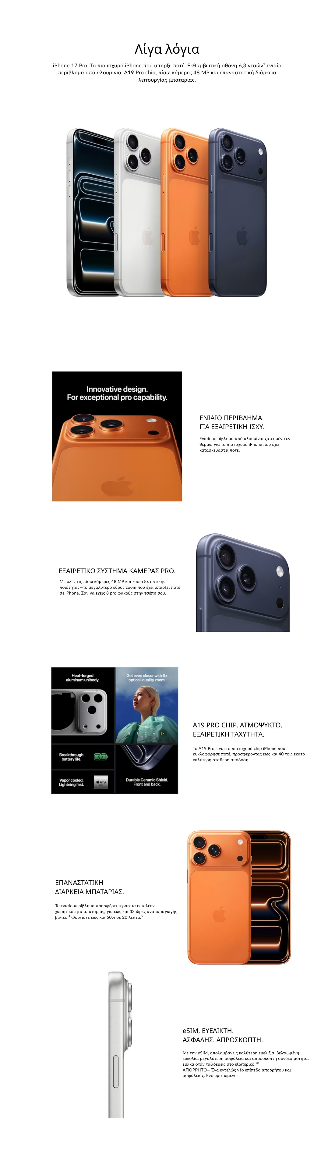 Το πιο ισχυρό iPhone που υπήρξε ποτέ. Εκθαμβωτική οθόνη 6,3ιντσών ενιαίo περίβλημα από αλουμίνιο, A19 Pro chip, πίσω κάμερες 48 MP και επαναστατική διάρκεια λειτουργίας μπαταρίας.