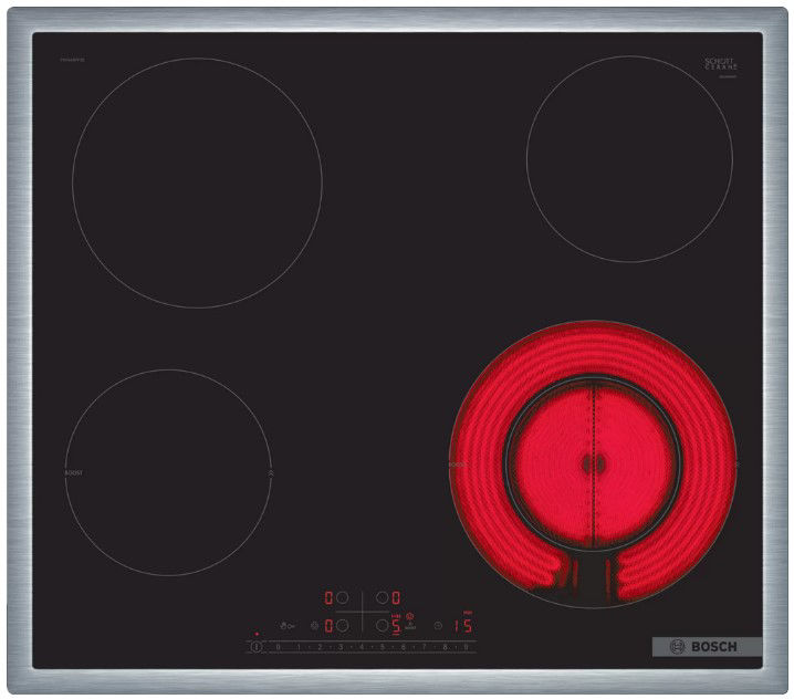 Περιμετρικό πλαίσιο: Ένα πλαίσιο από ανοξείδωτο χάλυβα γύρω από την εστία, ιδανικό για την εγκατάσταση σε υπάρχουσες εγκοπές πάγκου.