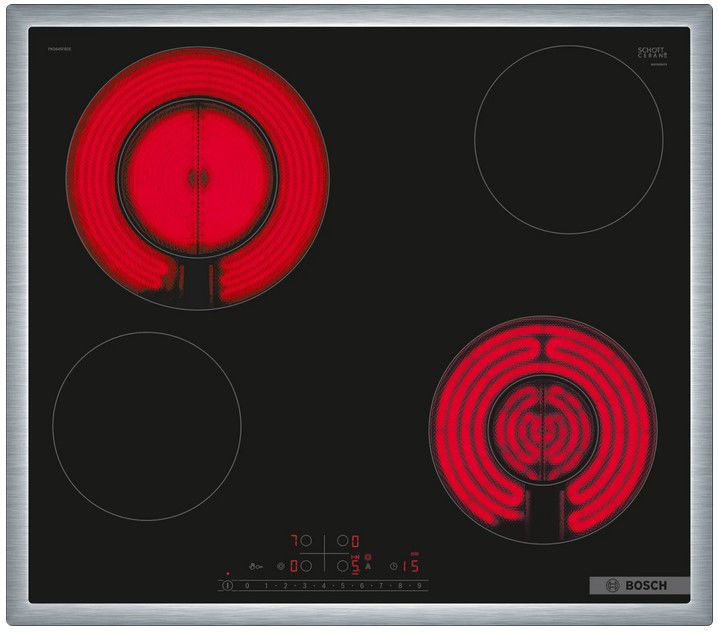 Ηλεκτρική εστία 60cm εντοιχιζόμενη με πλαίσιο από ανοξείδωτο χάλυβα, σε μαύρο χρώμα.