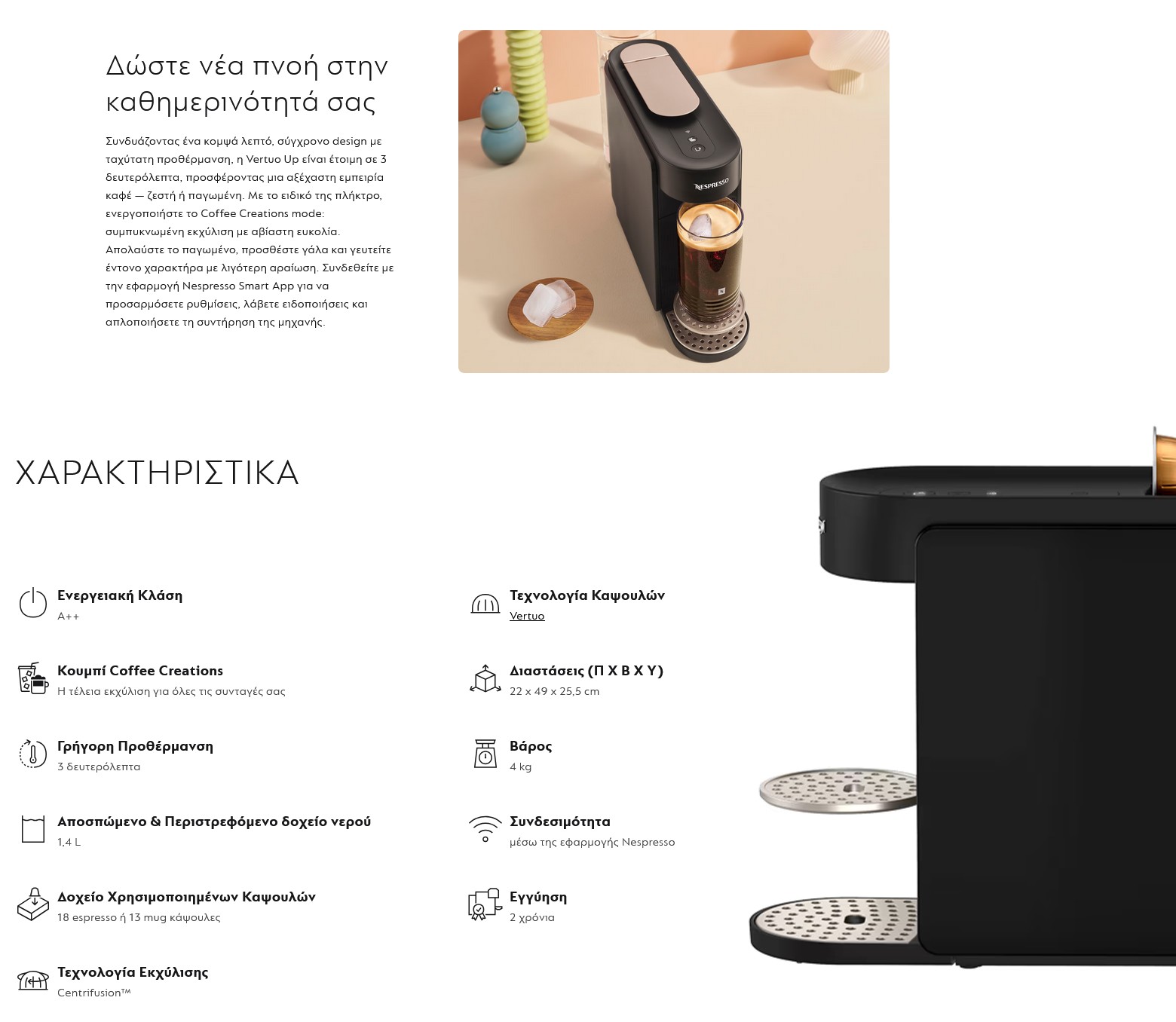 -Συνδεσιμότητα μέσω του Nespresso Smart App: Προσαρμόστε το μέγεθος και τη θερμοκρασία του φλιτζανιού, διευκολύνετε τη συντήρηση, λάβετε ειδοποιήσεις σε πραγματικό χρόνο και αποκτήστε πρόσβαση σε συνταγές βήμα-βήμα από το τηλέφωνό σας.