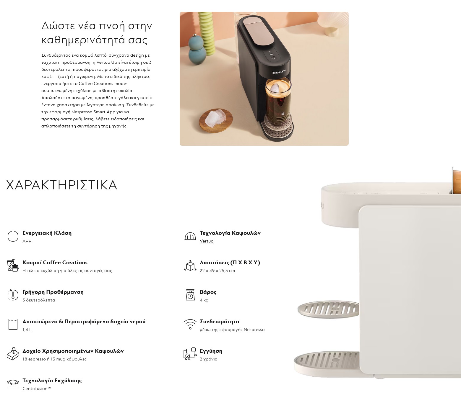 -Συνδεσιμότητα μέσω του Nespresso Smart App: Προσαρμόστε το μέγεθος και τη θερμοκρασία του φλιτζανιού, διευκολύνετε τη συντήρηση, λάβετε ειδοποιήσεις σε πραγματικό χρόνο και αποκτήστε πρόσβαση σε συνταγές βήμα-βήμα από το τηλέφωνό σας.