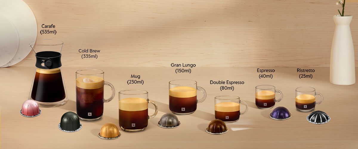 Πάνω από 40 premium και αρωματικοί καφέδες σε 7 μεγέθη φλιτζανιού (από espresso έως μεγάλες κούπες), ζεστοί, με πάγο ή σε συνταγή καφέ, με εγκεκριμένες μάρκες Vertuo.