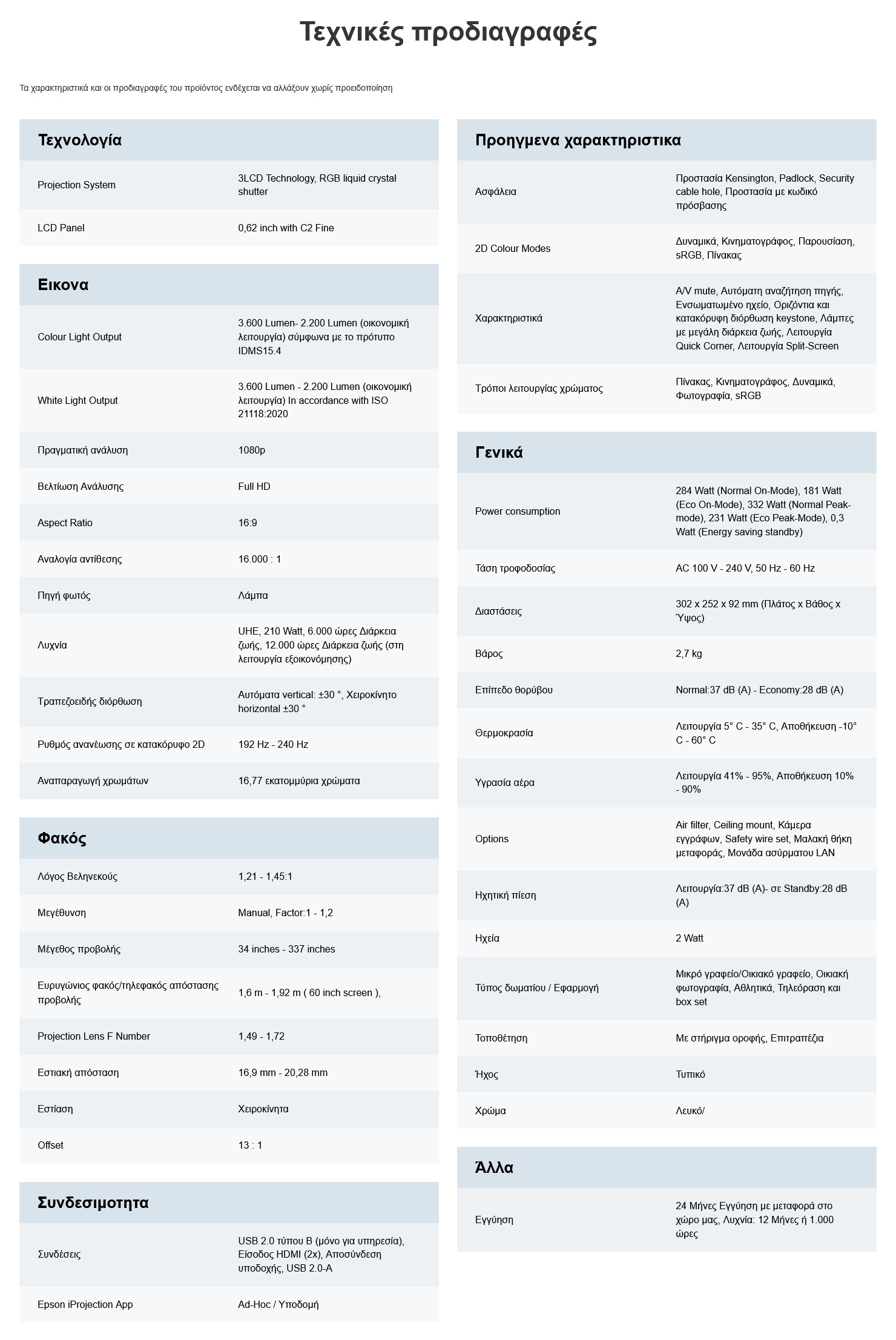 Η τεχνολογία 3LCD της Epson παρέχει εξίσου υψηλή φωτεινότητα έγχρωμων και λευκών αποχρώσεων (CLO) 3.600 lumen, ώστε να μπορείτε να βλέπετε ζωντανές και ρεαλιστικές εικόνες.