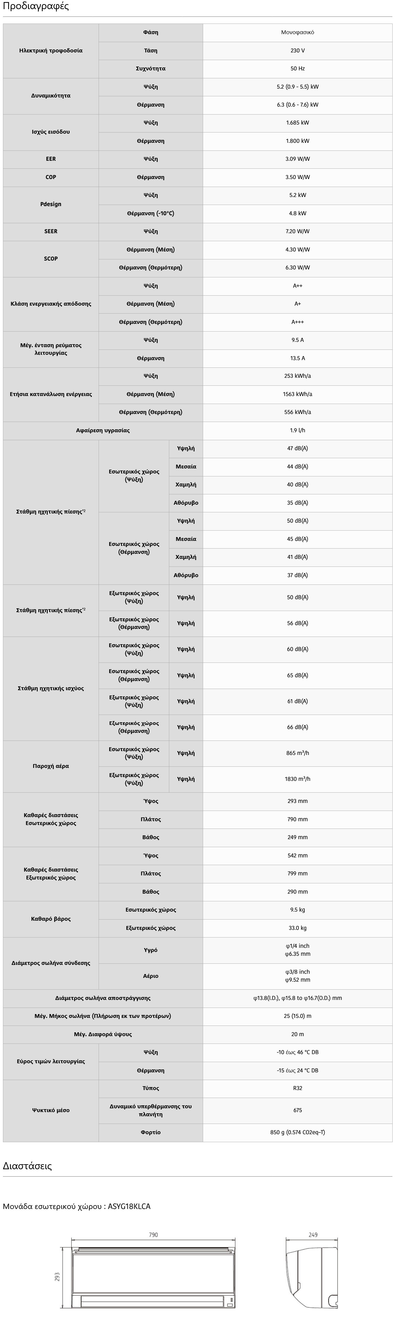Διαστάσεις εσωτερική μονάδα (ΥxΠxΒ) mm : 293x790x249