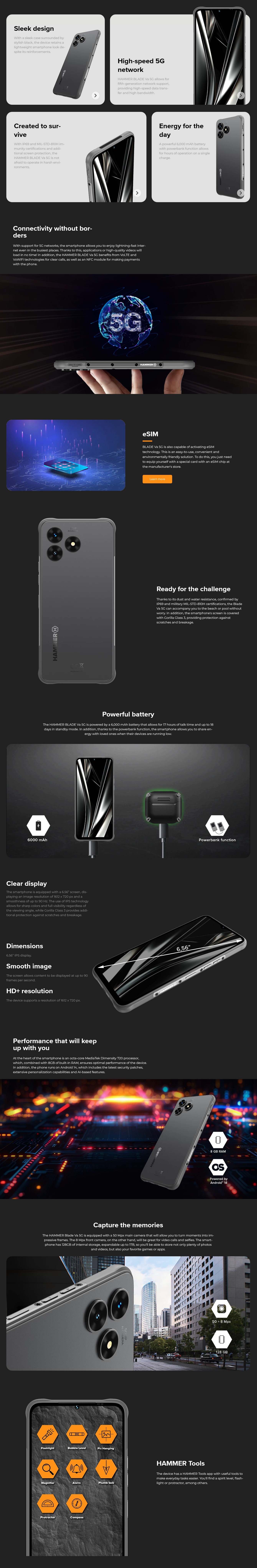 Το HAMMER BLADE Va 5G είναι ένα smartphone που κρύβει ένα σχέδιο ανθεκτικό στο νερό, τη σκόνη και την πρόσκρουση κάτω από το λεπτό κέλυφος του, όπως αποδεικνύεται από τις πιστοποιήσεις IP69 και στρατιωτικών MIL-STD-810H.