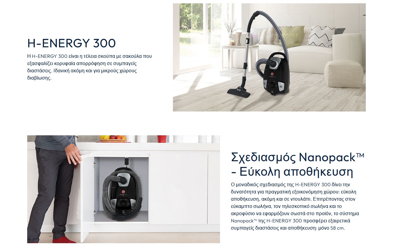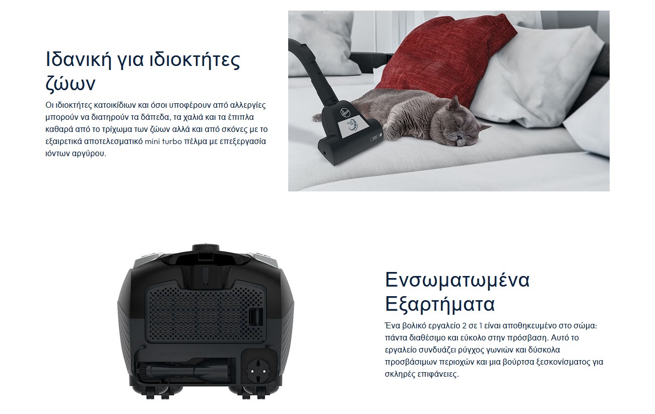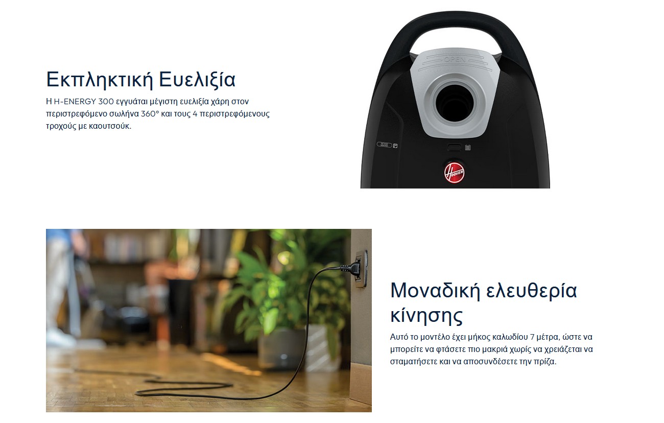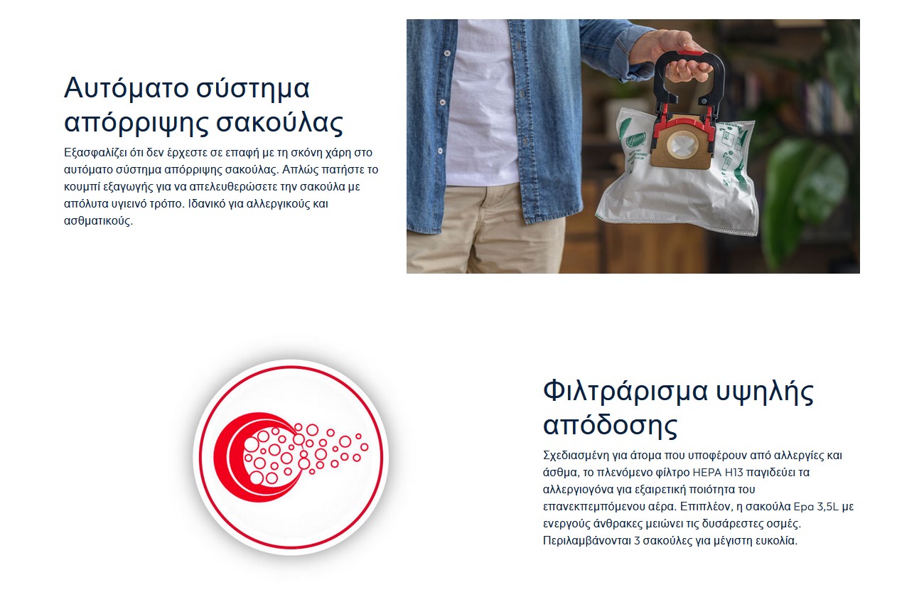 Ισχύος 850 W, χωρητικότητα σακούλας 4 lt και ακτίνα δράσης 9,5 m.