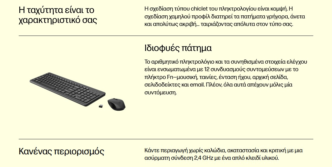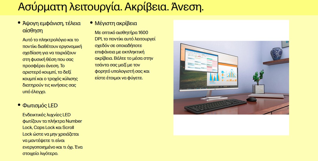 Αυτό το πληκτρολόγιο και το ποντίκι διαθέτουν εργονομική σχεδίαση για να ταιριάζουν στη φυσική θέση που σας προσφέρει άνεση. Το αριστερό κουμπί, το δεξί κουμπί και ο τροχός κύλισης διατηρούν τις κινήσεις σας υπό έλεγχο.