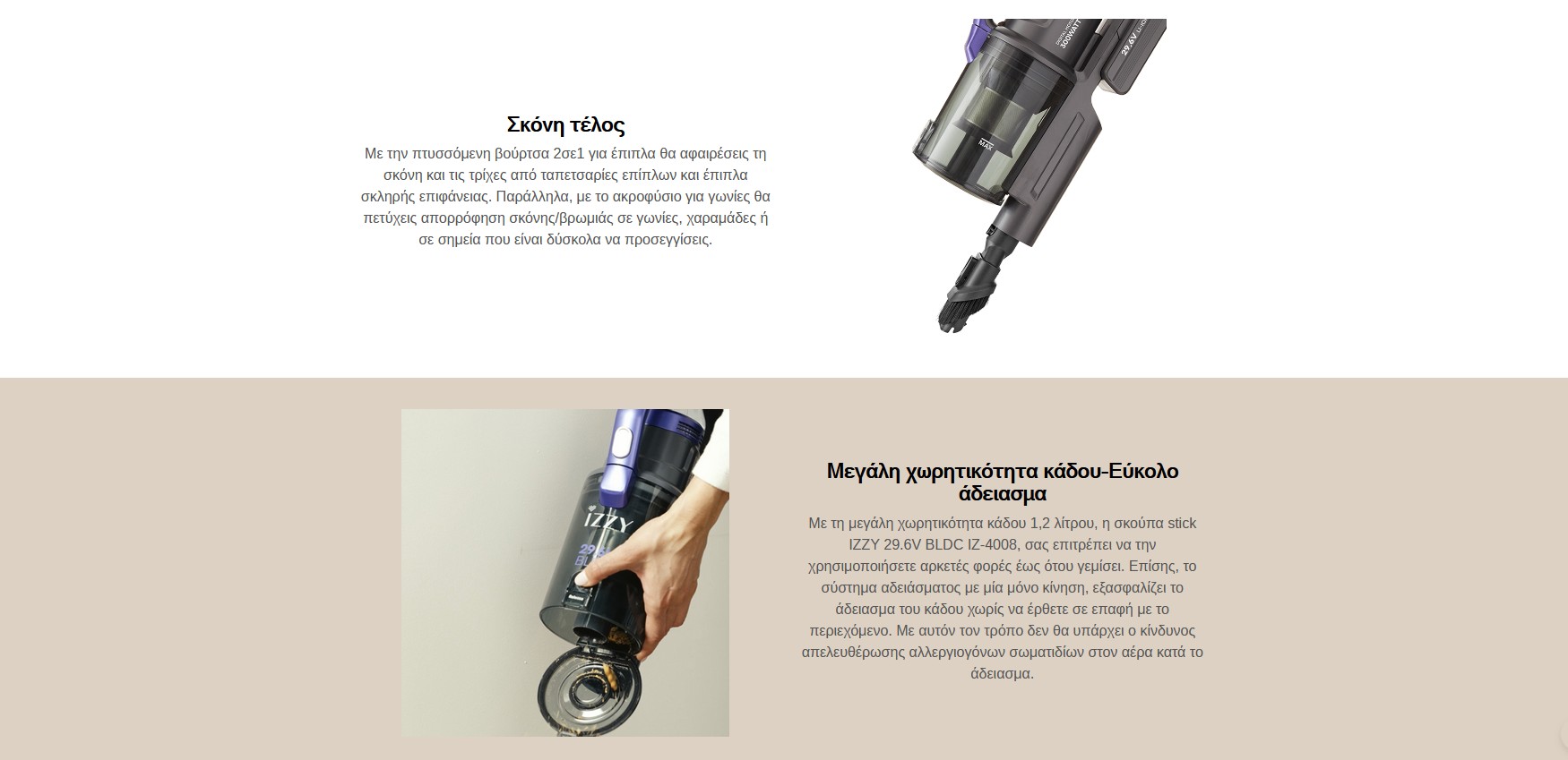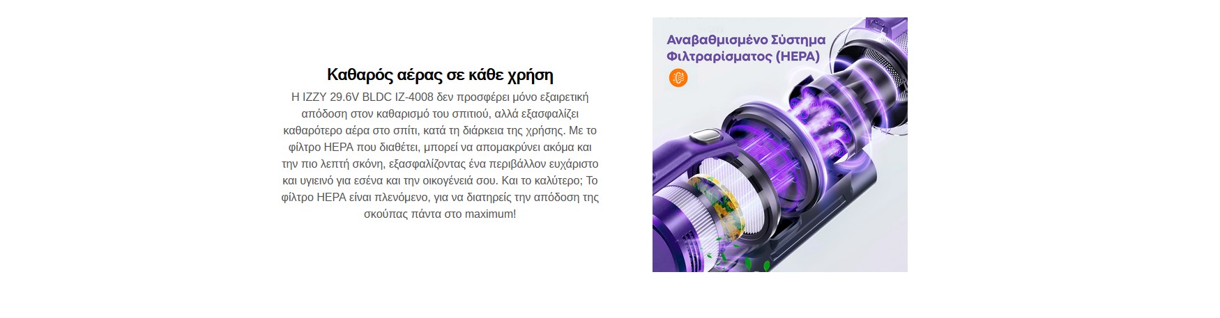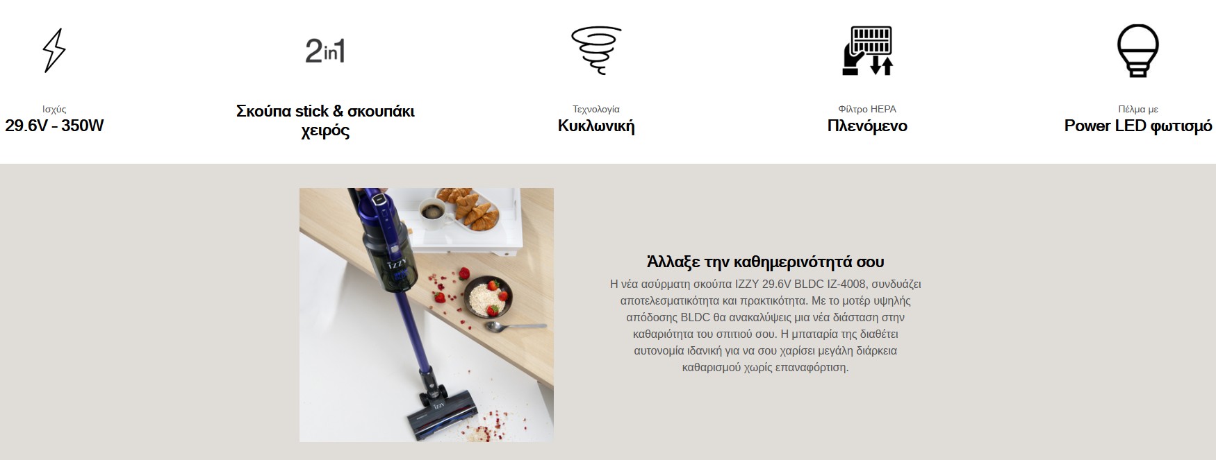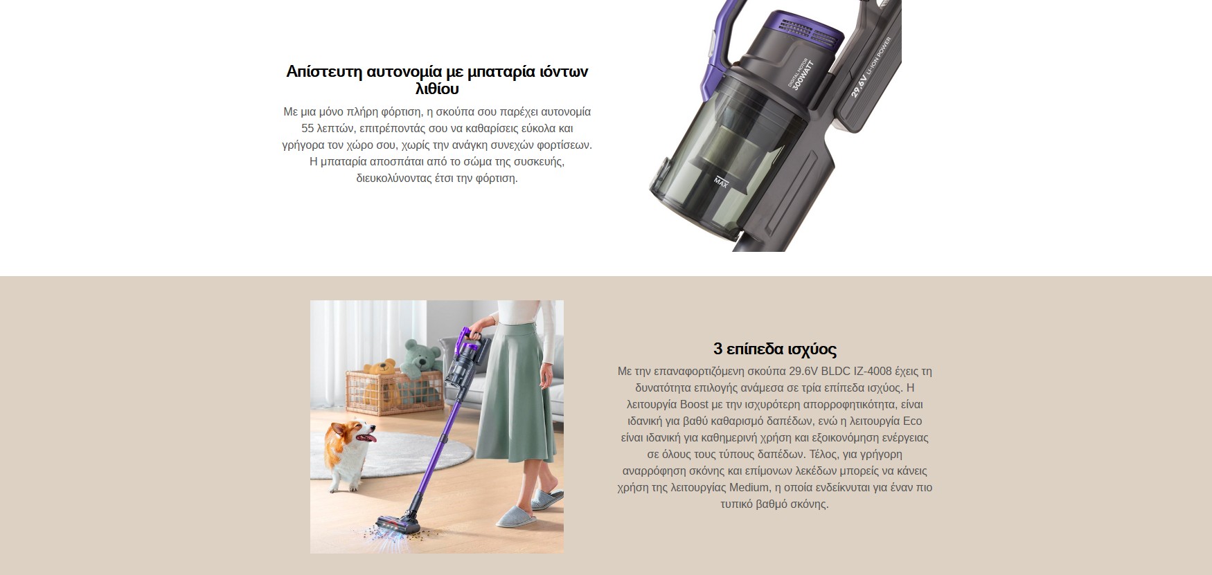 Με κυκλωνική τεχνολογία, 2σε1 σκούπα stick & σκουπάκι χειρός και μοτέρ υψηλής απόδοσης 29,6V.