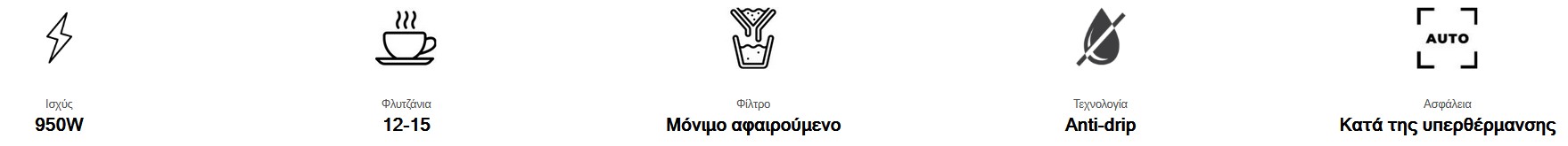 Με ισχύ 950W, χωρητικότητα 12-15 φλυτζάνια και τεχνολογία Anti-drip, για ασφαλή αφαίρεση της κανάτας.