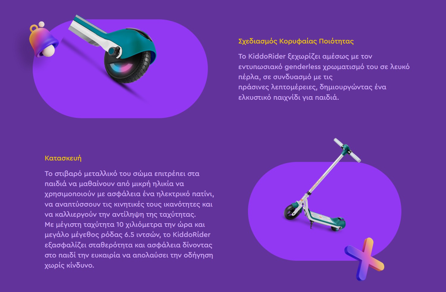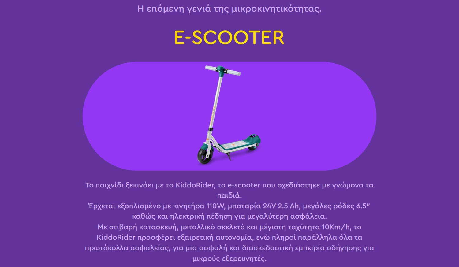 Το παιχνίδι ξεκινάει με το KiddoRider, το e-scooter που σχεδιάστηκε με γνώμονα τα παιδιά.