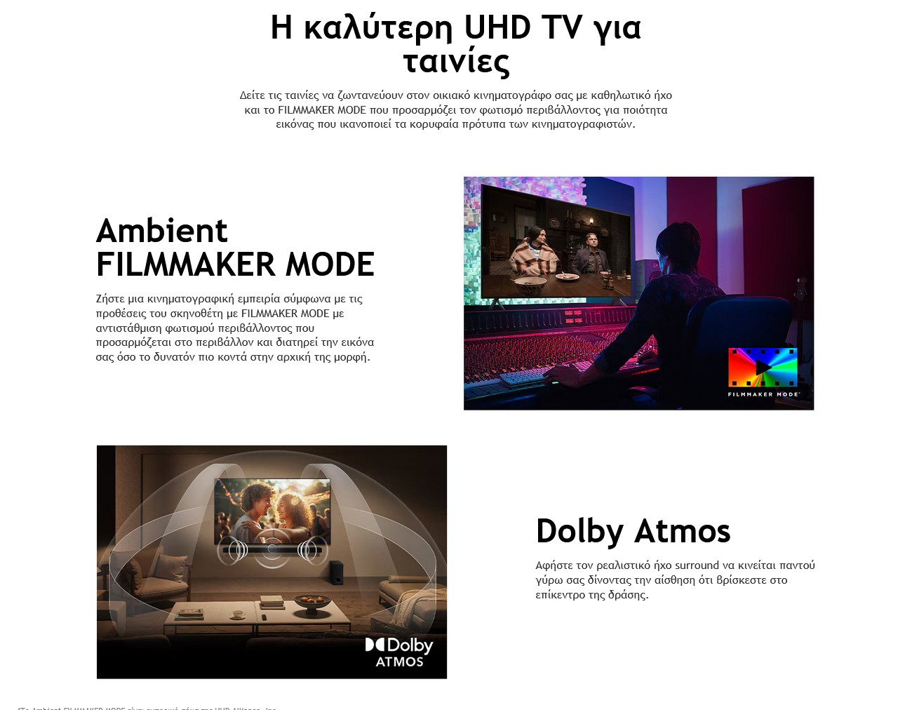Ζήστε μια κινηματογραφική εμπειρία σύμφωνα με το όραμα του σκηνοθέτη με FILMMAKER MODE με αντιστάθμιση φωτισμού περιβάλλοντος που προσαρμόζεται στον χώρο και διατηρεί την εικόνα σας όσο το δυνατόν πιο κοντά στην αρχική της μορφή.