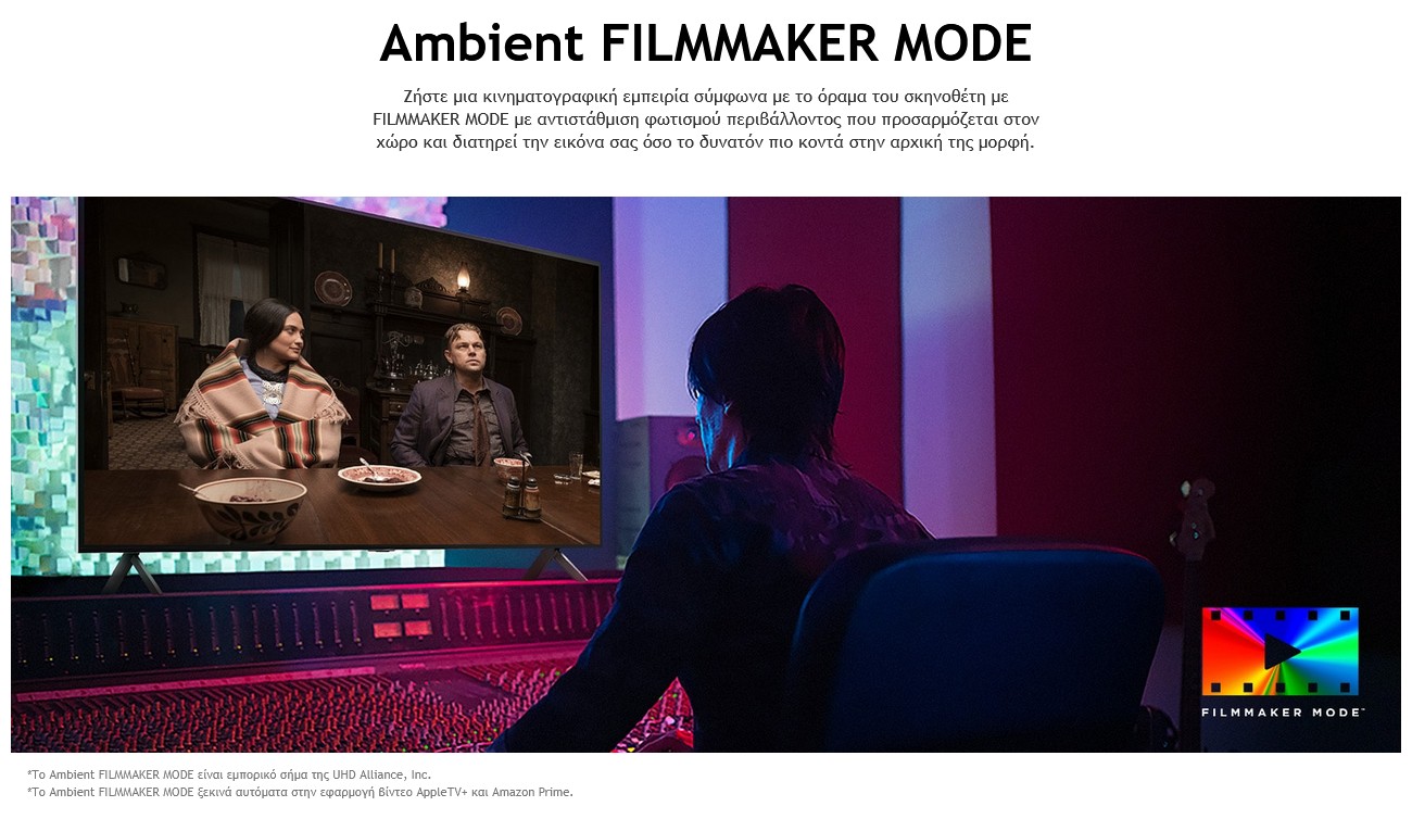 Ζήστε μια κινηματογραφική εμπειρία σύμφωνα με το όραμα του σκηνοθέτη με FILMMAKER MODE με αντιστάθμιση φωτισμού περιβάλλοντος που προσαρμόζεται στον χώρο και διατηρεί την εικόνα σας όσο το δυνατόν πιο κοντά στην αρχική της μορφή.