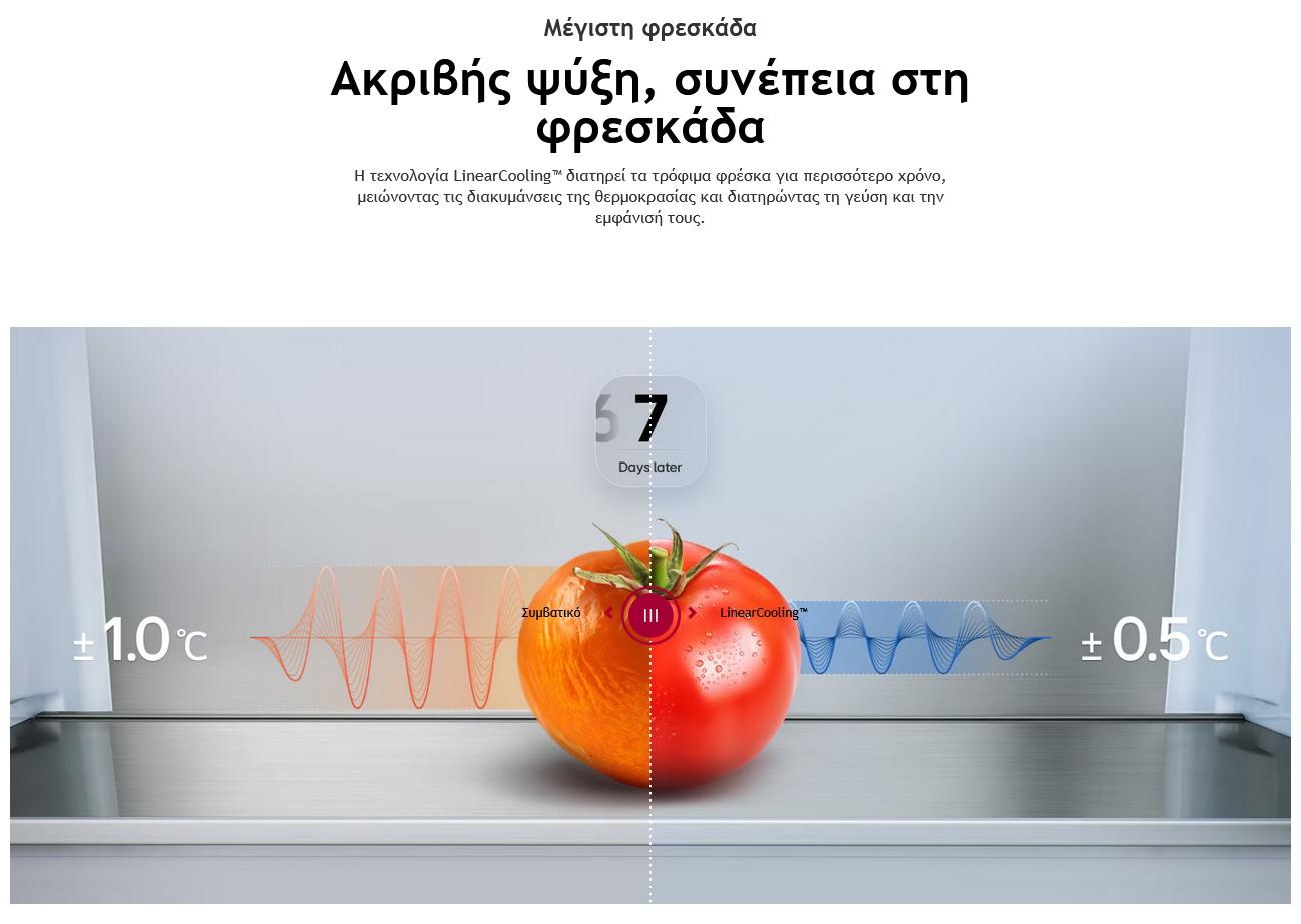 Η τεχνολογία LinearCooling διατηρεί τα τρόφιμα φρέσκα για περισσότερο χρόνο, μειώνοντας τις διακυμάνσεις της θερμοκρασίας και διατηρώντας τη γεύση και την εμφάνισή τους.