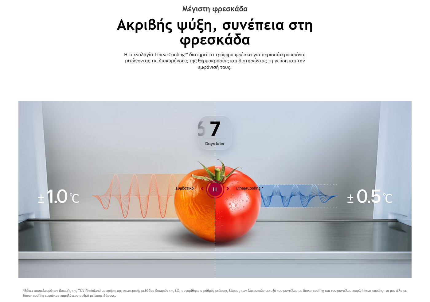 Η τεχνολογία LinearCooling διατηρεί τα τρόφιμα φρέσκα για περισσότερο χρόνο, μειώνοντας τις διακυμάνσεις της θερμοκρασίας και διατηρώντας τη γεύση και την εμφάνισή τους.