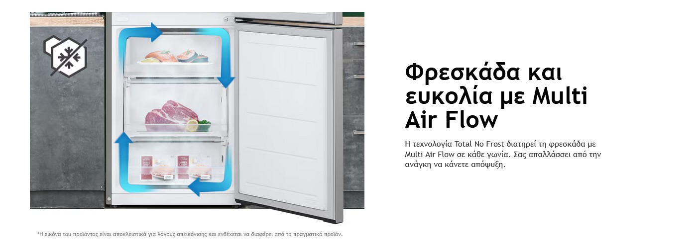 Η τεχνολογία Total No Frost διατηρεί τη φρεσκάδα με Multi Air Flow σε κάθε γωνία. Σας απαλλάσσει από την ανάγκη να κάνετε απόψυξη.