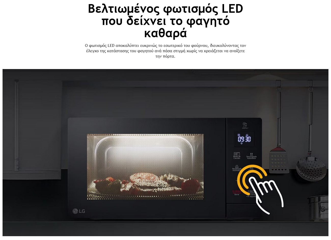 Τρόποι μαγειρέματος : Μικροκύματα, Αυτόματο μαγείρεμα (8 συνταγές), Grill, Συνδυασμός με Grill, Αυτόματη απόψυξη