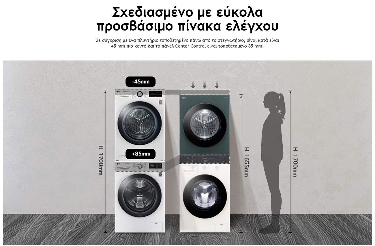 Σε σύγκριση με ένα πλυντήριο τοποθετημένο πάνω από το στεγνωτήριο, είναι κατά είναι 45 mm πιο κοντό και το πάνελ Center Control είναι τοποθετημένο 85 mm.