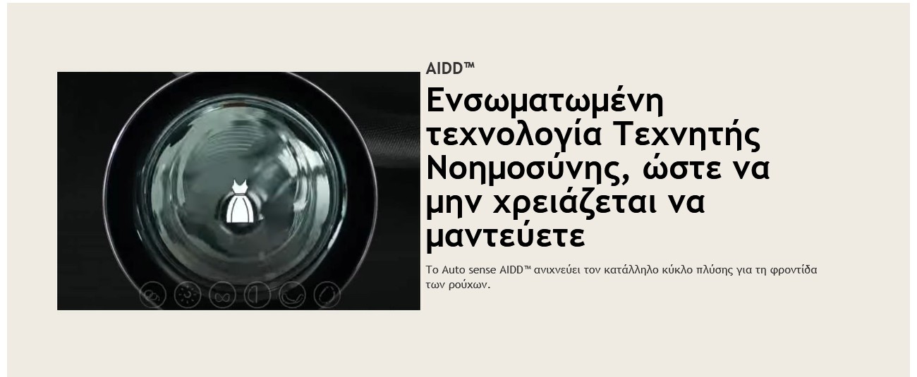 Το Auto sense AIDD ανιχνεύει τον κατάλληλο κύκλο πλύσης για τη φροντίδα των ρούχων.