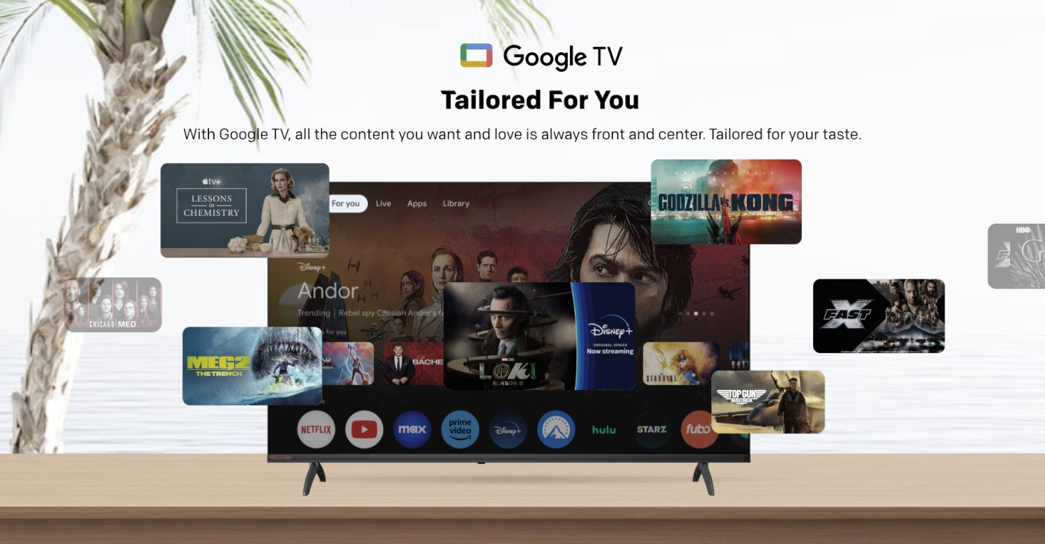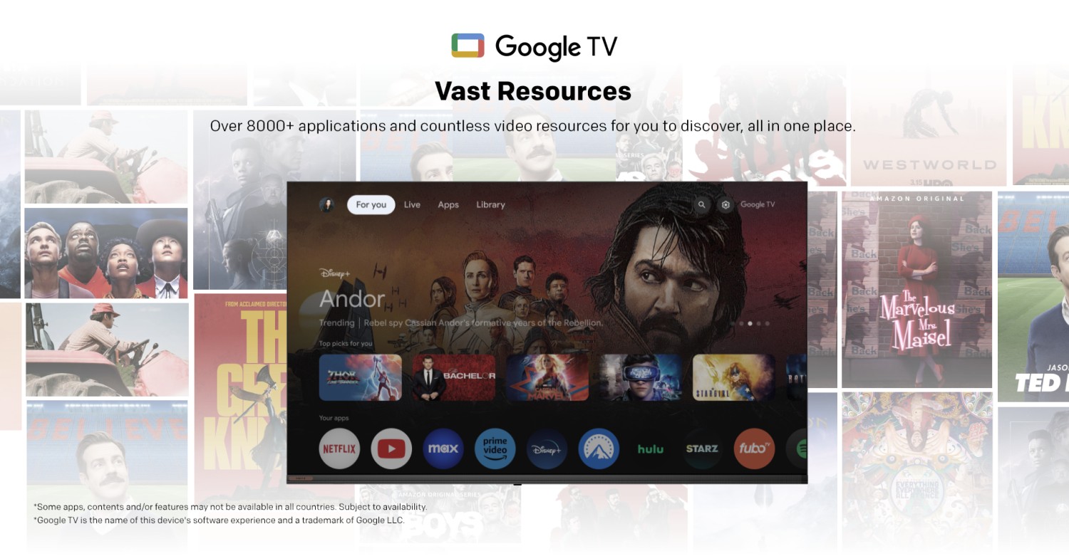 Το έξυπνο λειτουργικό σύστημα του Google TV σας δίνει απεριόριστη πρόσβαση σε μια τεράστια βιβλιοθήκη περιεχομένου, συμπεριλαμβανομένων σειρών, ταινιών, εφαρμογών και παιχνιδιών.