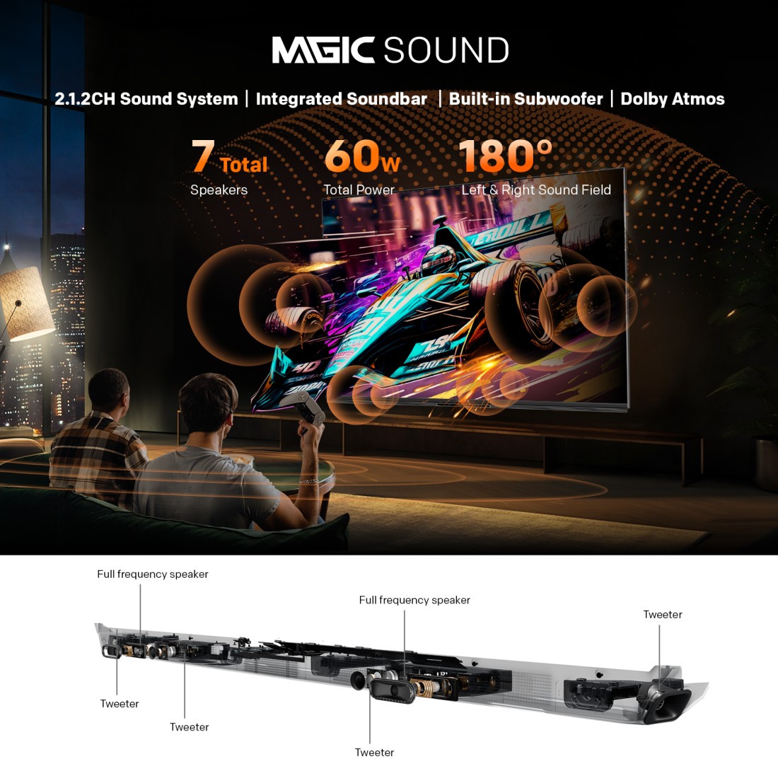 Με 6 ηχεία και ένα subwoofer 20W δηλαδή ουσιαστικά ένα ενσωματωμένο soundbar, την λειτουργία Dolby Atmos, Dolby Digital και Dolby Digital Plus σας δίνει την δυνατότητα να απολαμβάνεται κινηματογραφικό ήχο Surround στο σαλόνι σας.