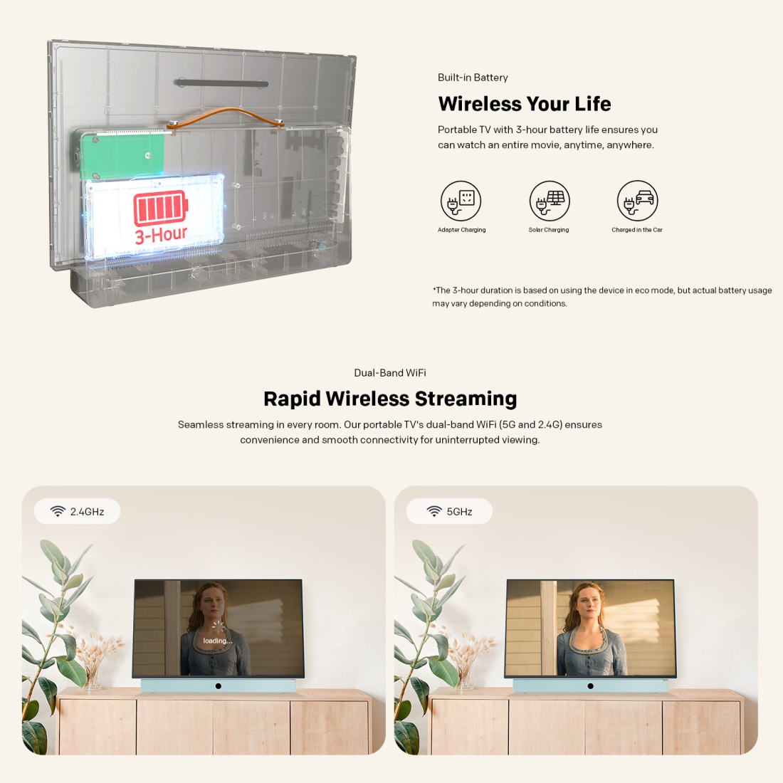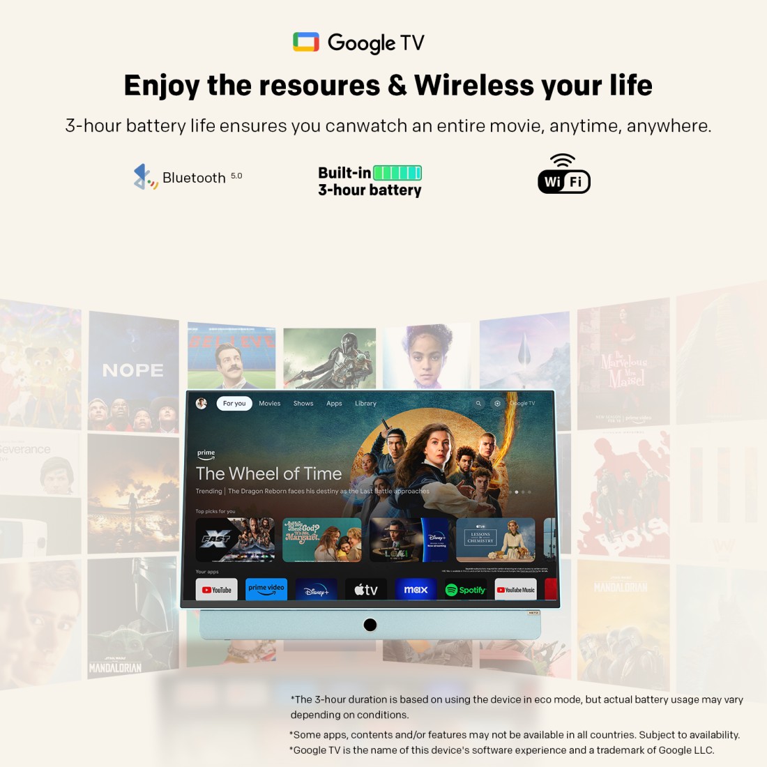 Το έξυπνο λειτουργικό σύστημα του Google TV σας δίνει απεριόριστη πρόσβαση σε μια τεράστια βιβλιοθήκη περιεχομένου, συμπεριλαμβανομένων σειρών, ταινιών, εφαρμογών και παιχνιδιών, Η φόρτιση μπορεί να γίνει είτε με τον μετασχηματιστή 12Volt, είτε από το αυτοκίνητο, είτε από ηλιακό φορτιστή.