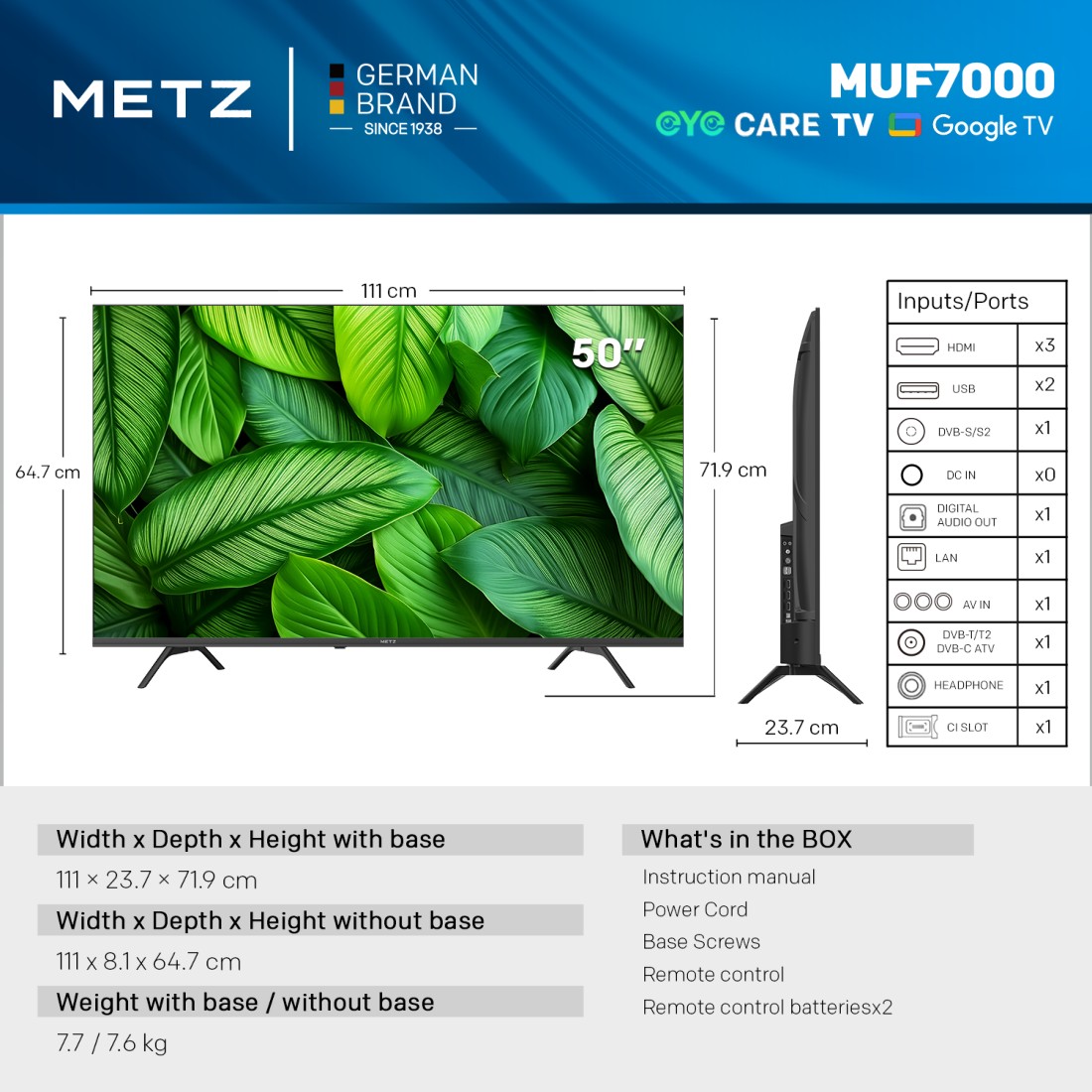 Με οθόνη 50" Inches, LED 4K, με ανάλυση 3840 x 2160. Με λειτουρικό Google TV και ενσωματωμένες εφαρμογές.