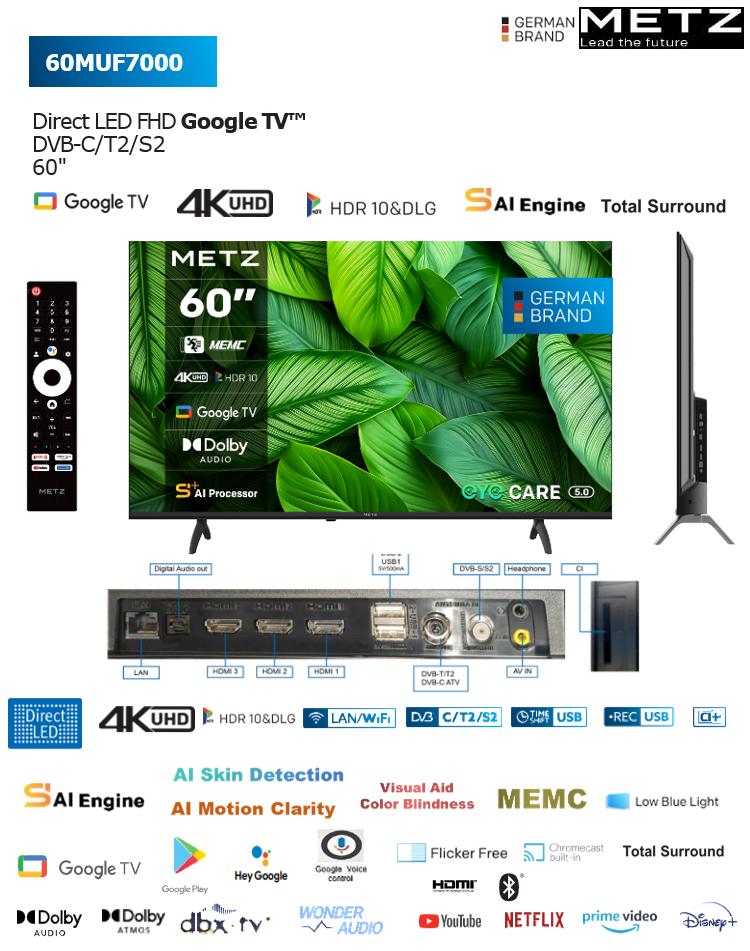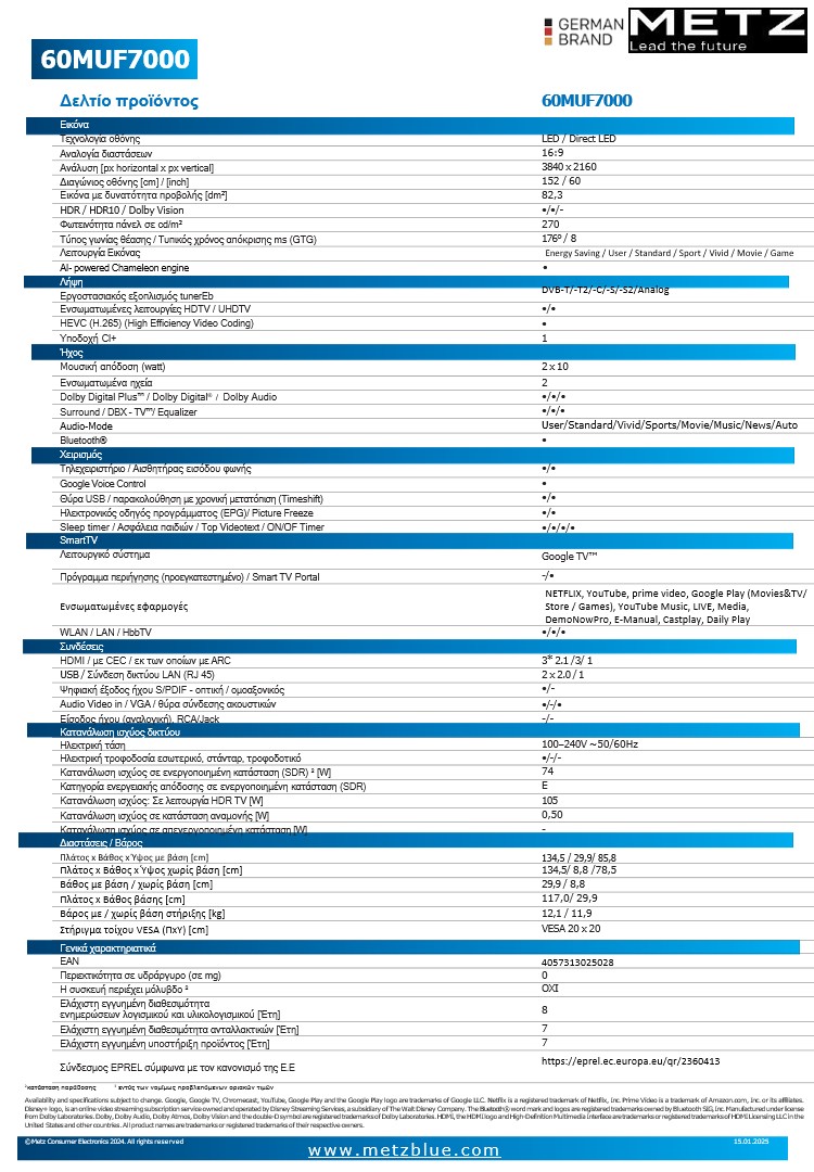 Με οθόνη 60" Inches, LED 4K, με ανάλυση 3840 x 2160. Με λειτουρικό Google TV και ενσωματωμένες εφαρμογές.