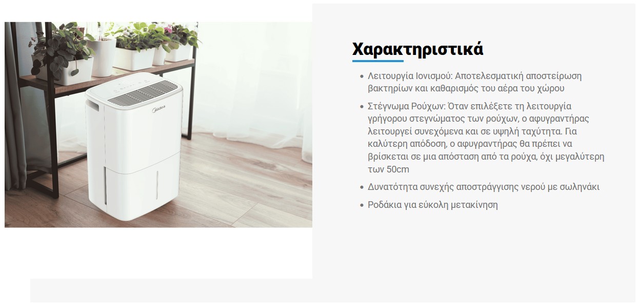 Επιπλέον χαρακτηριστικά : 2 ταχύτητες (Υψηλή Χαμηλή), Auto defrost, Αθόρυβη λειτουργία, Δυνατότητα συνεχής αποστράγγισης νερού με σωληνάκι, Ένδειξη γεμάτου δοχείου νερού, Ορατή στάθμη νερού στο δοχείο, Ροδάκια για εύκολη μετακίνηση, Ρύθμιση αφύγρανσης (εύρος ρύθμισης 35%-85%), Χρονοδιακόπτης 24ωρών.
