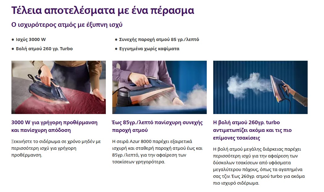 Μέγιστη ισχύς σιδερώματος με το νέο Philips Azur 8000 Series. Με ατμό turbo 260 γρ., μπορείτε πλέον να απομακρύνετε ακόμα και τις πιο επίμονες τσακίσεις. Ξεκινήστε αμέσως το σιδέρωμα με ισχύ 3000 W και επιτύχετε τέλεια αποτελέσματα με ισχυρό, συνεχή ατμό.