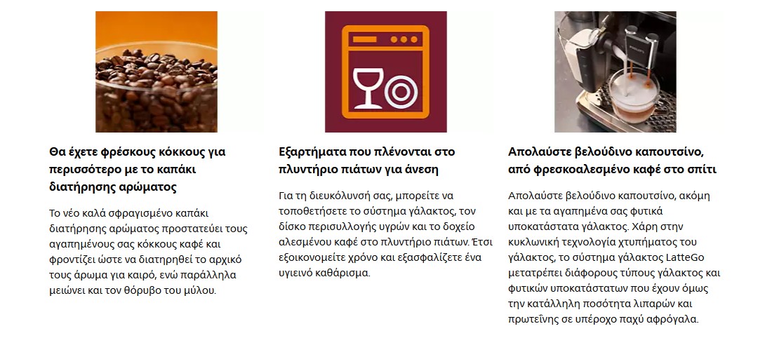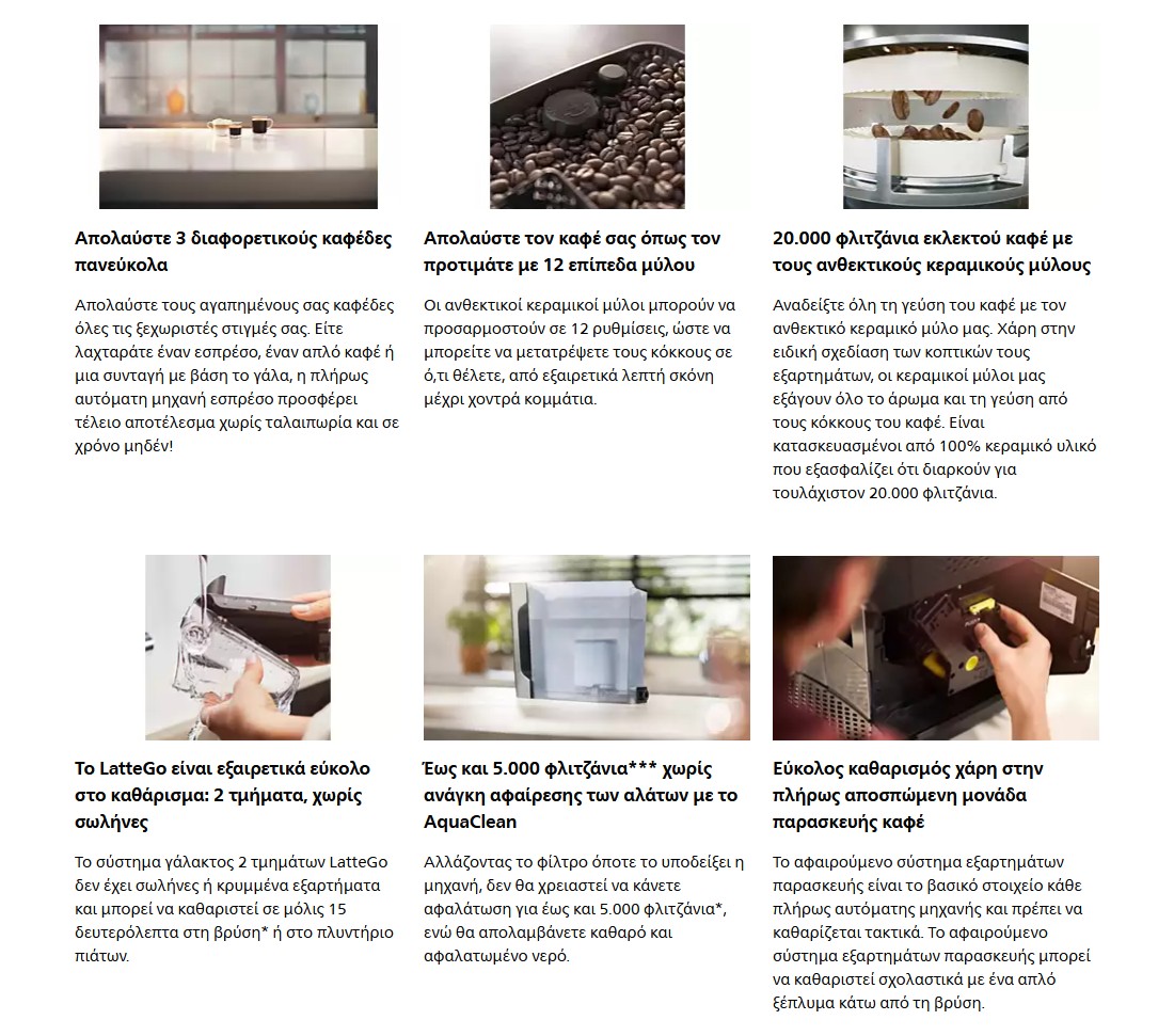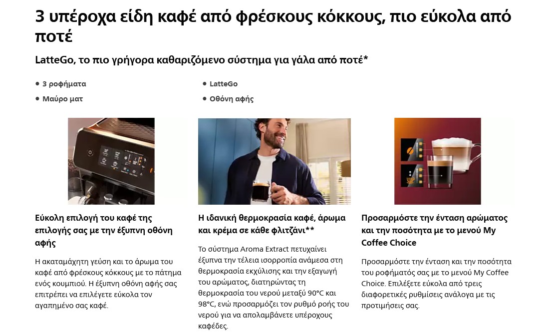 Φτιάξτε εύκολα αρωματικούς καφέδες όπως εσπρέσο και καπουτσίνο με το πάτημα ενός κουμπιού. Η LatteGo παρασκευάζει υπέροχο αφρόγαλα, ρυθμίζεται εύκολα και καθαρίζεται μόλις σε 15 δευτερόλεπτα.