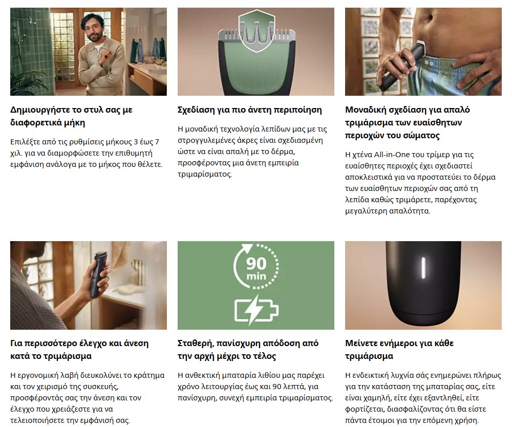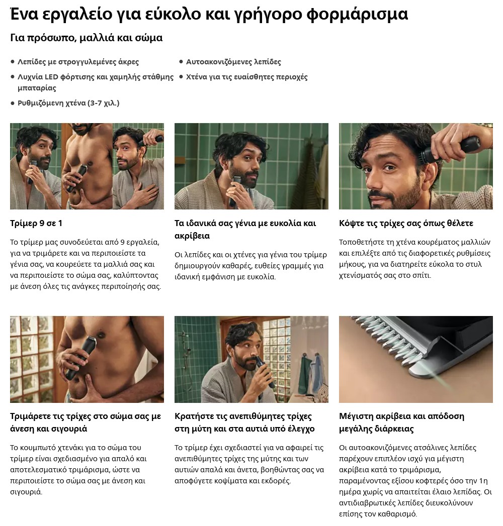 Σχεδιασμένο για ευελιξία και αποδοτικότητα. Με 9 εξαρτήματα, αυτοακονιζόμενες ατσάλινες λεπίδες για ακρίβεια μεγάλης διάρκειας και στρογγυλεμένα άκρα για απαλότερο τριμάρισμα, το τρίμερ σάς προσφέρει την ευελιξία να αντιμετωπίζετε αποτελεσματικά όλες τις ανάγκες περιποίησης.