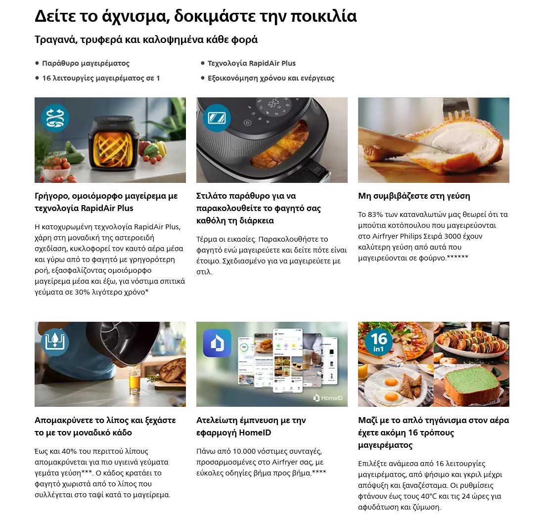 Υπερβείτε το απλό τηγάνισμα με 16 λειτουργίες, από γρήγορο ψήσιμο μέχρι πολύωρο σιγομαγείρεμα. Νόστιμα, σπιτικά γεύματα με λίγα εύκολα βήματα. Και μέσα από το κομψό παράθυρο, μπορείτε να βλέπετε πότε είναι όλα έτοιμα στην εντέλεια, τραγανά και τρυφερά.