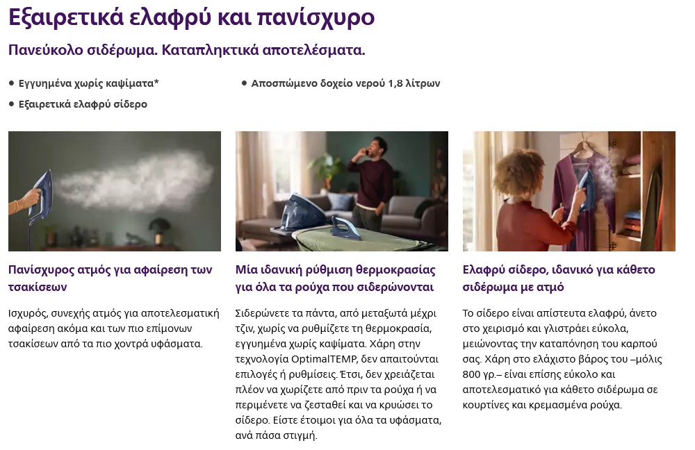 Με ισχύς 2100W και τεχνολογία OptimalTEMP που δεν θα προκαλέσει ποτέ καψίματα σε οποιοδήποτε ύφασμα που σιδερώνεται.