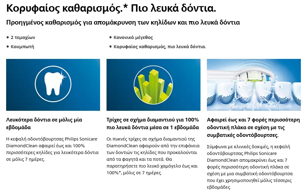 Η κεφαλή οδοντόβουρτσας DiamondClean είναι ιδανική για εκείνους που θέλουν όχι μόνο βαθύ καθαρισμό, αλλά και δόντια χωρίς κηλίδες για αστραφτερό, κατάλευκο χαμόγελο.