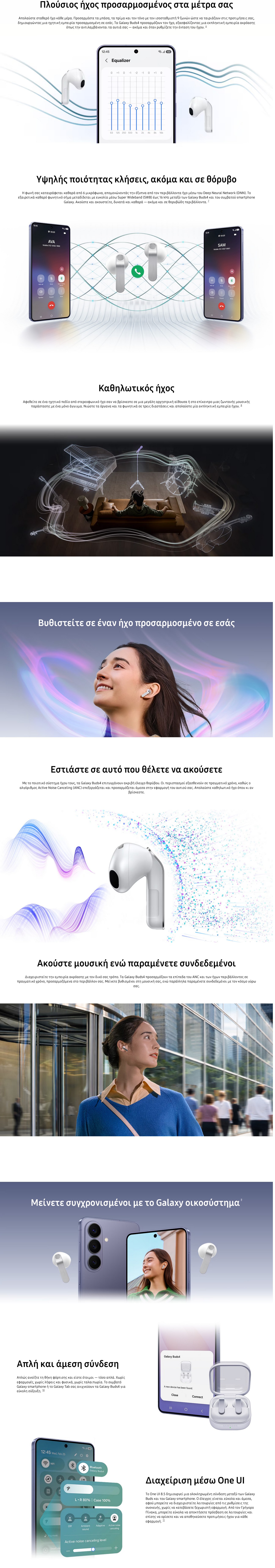 Απολαύστε όμορφα ισορροπημένο ήχο στα Galaxy Buds4, με την υποστήριξη ενός ηχείου ευρέος φάσματος 11 mm, που προσφέρει πλούσιο ήχο από σταθερά, ελεγχόμενα μπάσα έως καθαρά, λεπτομερή υψηλά.