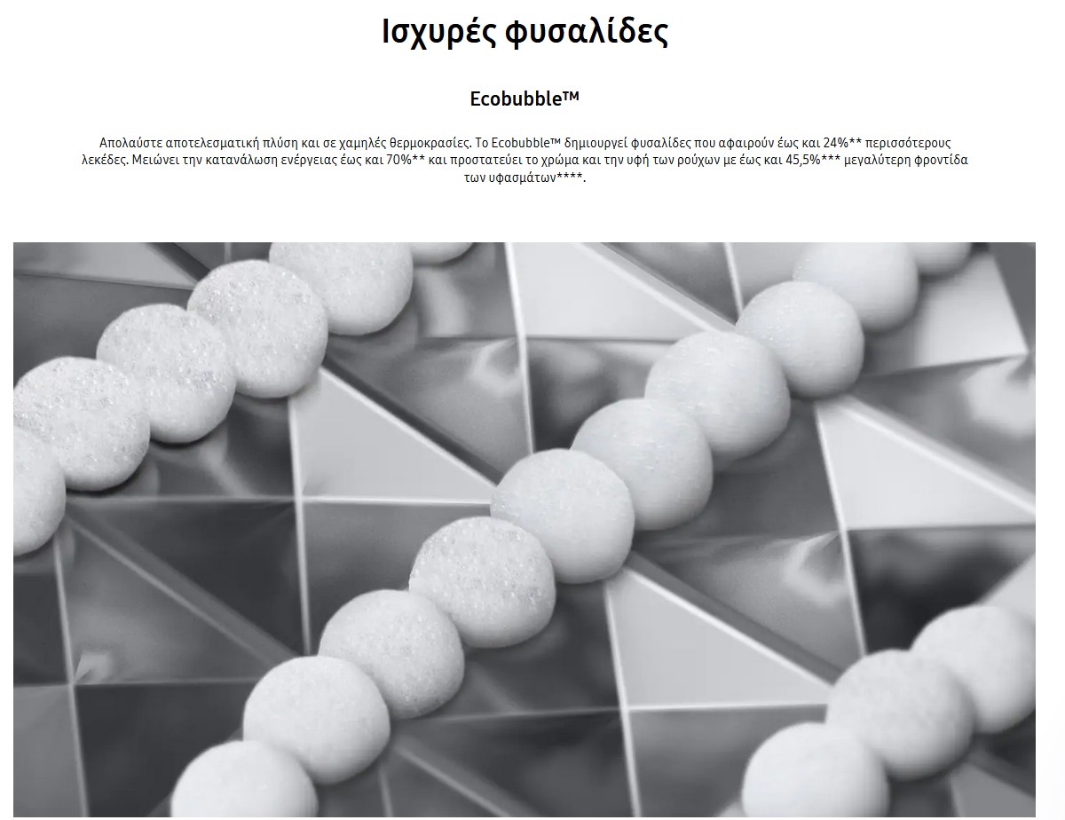 Απολαύστε αποτελεσματική πλύση και σε χαμηλές θερμοκρασίες. Το Ecobubble δημιουργεί φυσαλίδες που αφαιρούν έως και 24% περισσότερους λεκέδες. Μειώνει την κατανάλωση ενέργειας έως και 70%** και προστατεύει το χρώμα και την υφή των ρούχων με έως και 45,5% μεγαλύτερη φροντίδα των υφασμάτων.