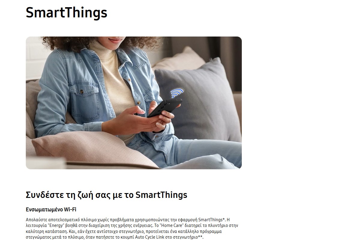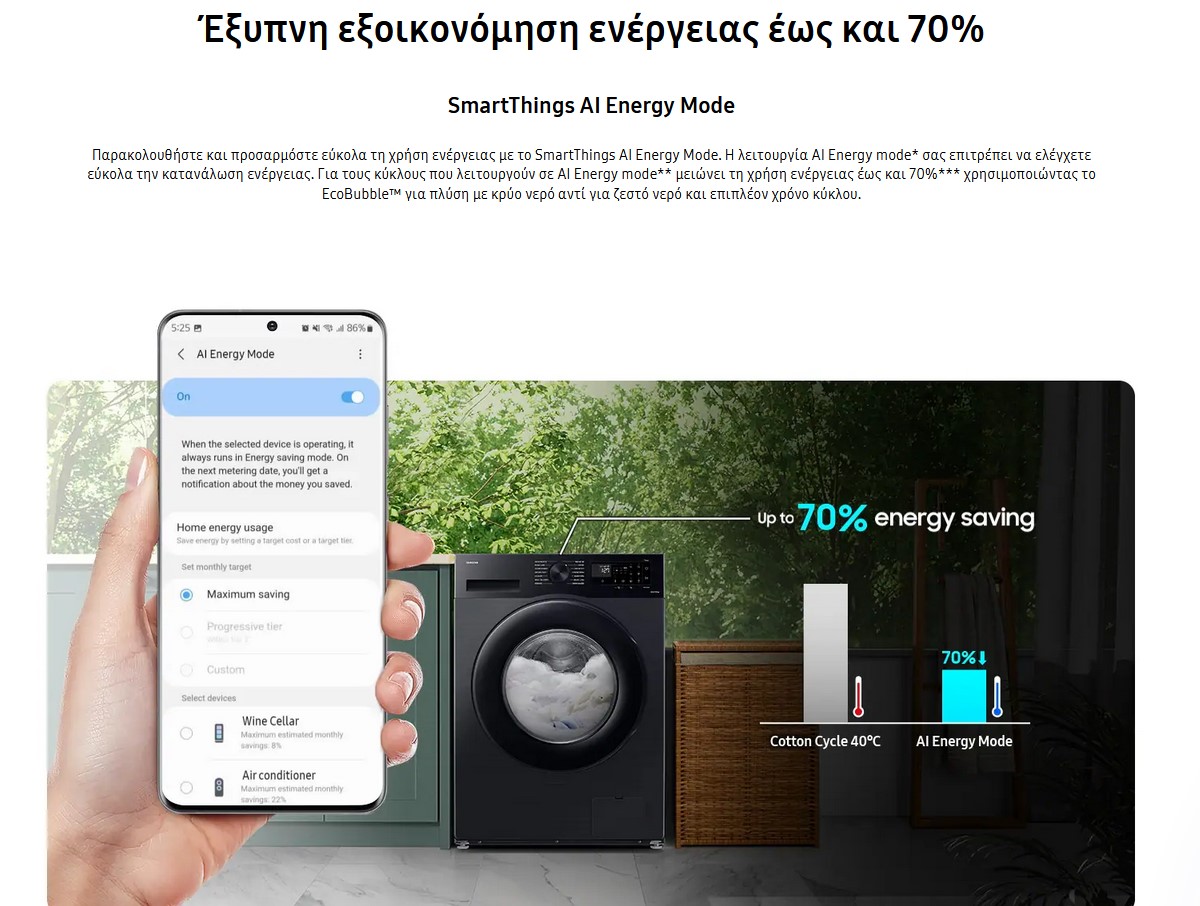 Παρακολουθήστε και προσαρμόστε εύκολα τη χρήση ενέργειας με το SmartThings AI Energy Mode. Η λειτουργία AI Energy mode σας επιτρέπει να ελέγχετε εύκολα την κατανάλωση ενέργειας. Για τους κύκλους που λειτουργούν σε AI Energy mode μειώνει τη χρήση ενέργειας έως και 70% χρησιμοποιώντας το EcoBubble για πλύση με κρύο νερό αντί για ζεστό νερό και επιπλέον χρόνο κύκλου.