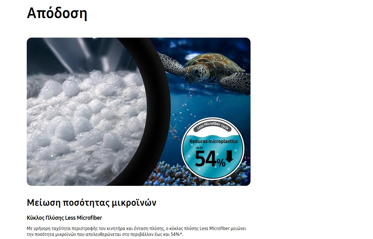 Με γρήγορη ταχύτητα περιστροφής του κινητήρα και ένταση πλύσης, ο κύκλος πλύσης LEss Microfiber μειώνει την ποσότητα μικροϊνών που απελευθερώνεται στο περιβάλλον έως και 54%.