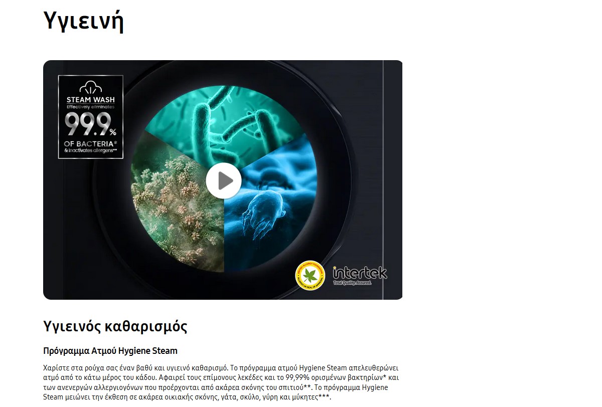 Χαρίστε στα ρούχα σας ένα βαθύ και υγιεινό καθαρισμό. Το πρόγραμμα ατμού Hygiene Steam απελευθερώνει ατμό από το κάτω μέρος του κάδου. Αφαιρεί του πείμονους λεκέδες και το 99,99% ορισμένων βακτηρίων και ταν ανενεργών αλλεργιογόνων που προέρχονται από ακάρεα σκόνης του σπιτιού. Το πρόγραμμα Hygiene Steam μειώνει την έκθεση σε ακάρεα οικιακήσ σκόνης, γάτα, σκύλο, γύρη και μύκητες.