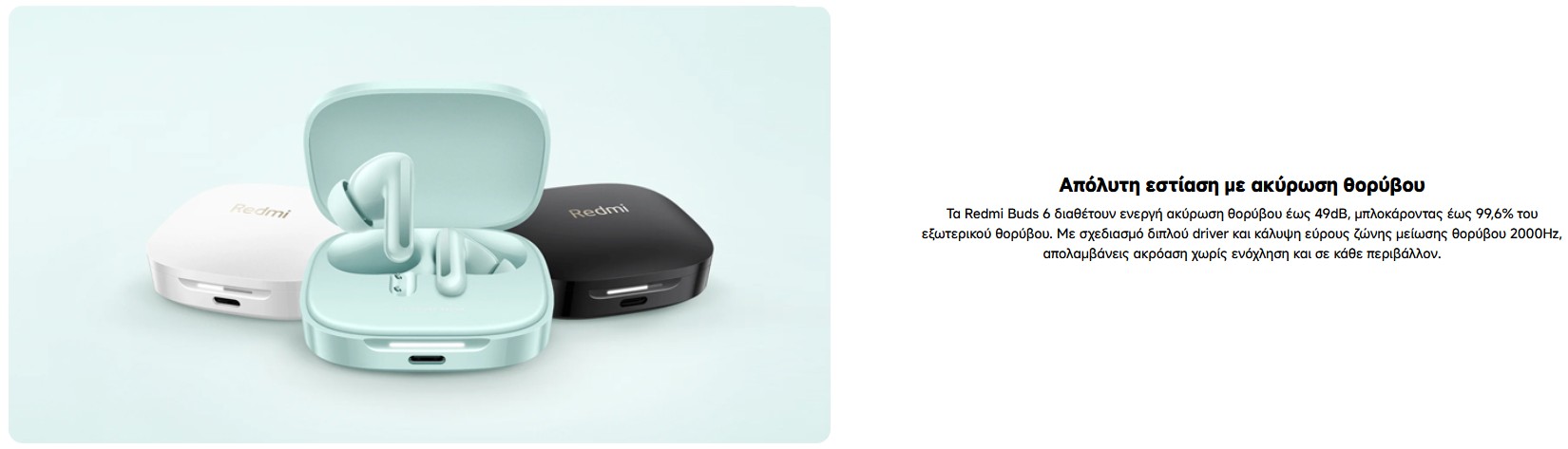 Απόλαυσε καθηλωτικό ήχο με τα Redmi Buds 6. Με 49dB ενεργή ακύρωση θορύβου, απομονώνεις κάθε θόρυβο και επικεντρώνεσαι στη μουσική ή τις κλήσεις σου.