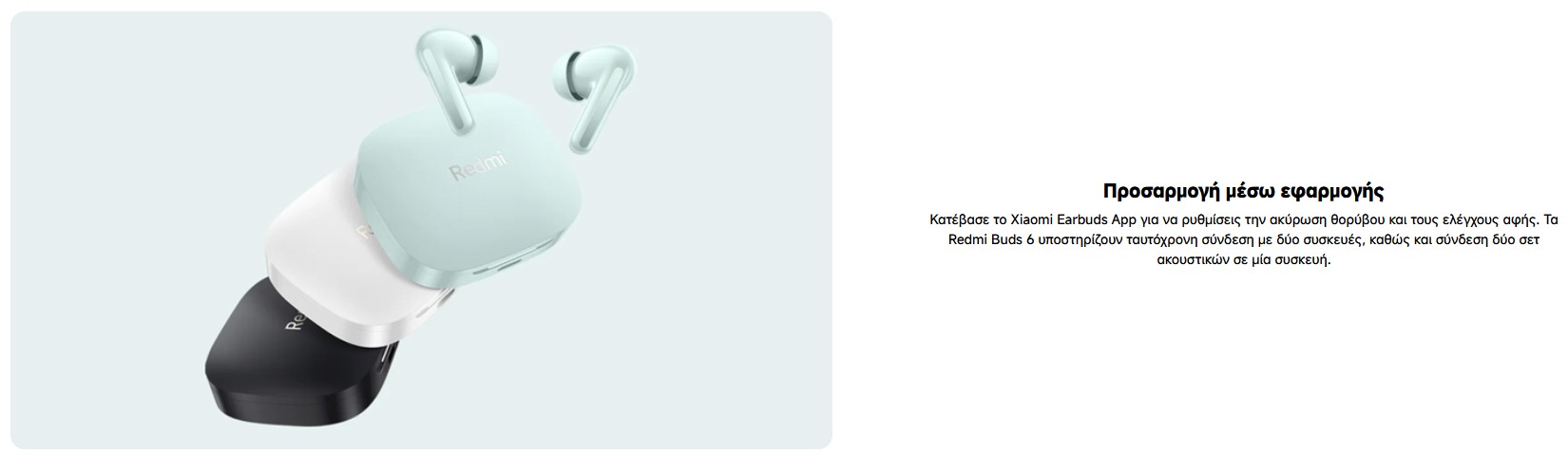 Περιεχόμενα συσκευασίας : Redmi Buds 6 x1, Καλώδιο φόρτισης Type-C x 1, Εγχειρίδιο χρήσης x 1, Καπάκι αυτιού S x 2, Καπάκι αυτιού L x 2