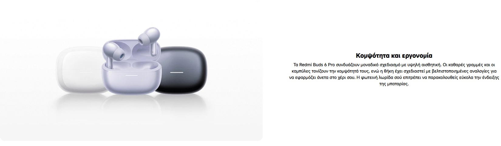 Περιεχόμενα συσκευασίας : Redmi Buds 6 Pro x1, Καλώδιο φόρτισης Type-C x 1, Εγχειρίδιο χρήσης x 1, Προστατευτικά αυτιού S x1, Προστατευτικά αυτιού L x1.