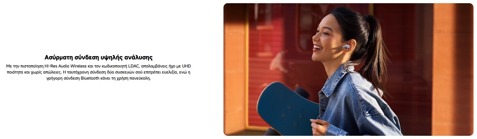 Ο Hi-Res ήχος με υποστήριξη LDAC σου προσφέρει πλούσιο, λεπτομερές ηχητικό τοπίο, ιδανικό για μουσική, ταινίες ή gaming. Με εντυπωσιακή αυτονομία και άνετη εφαρμογή, είναι τα earbuds που ακολουθούν τον ρυθμό σου παντού.