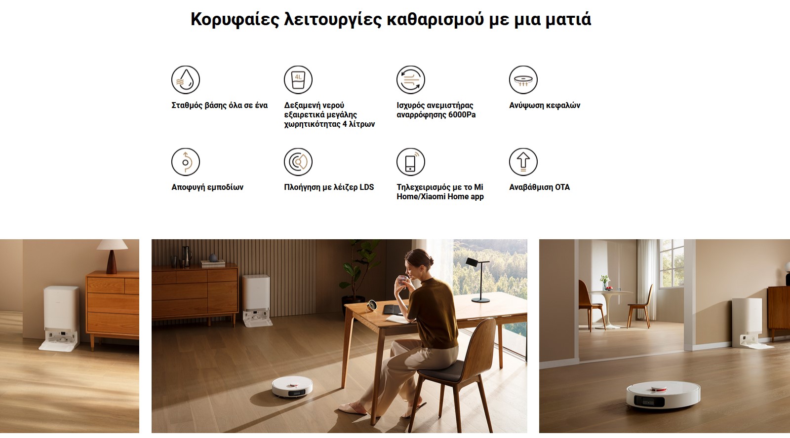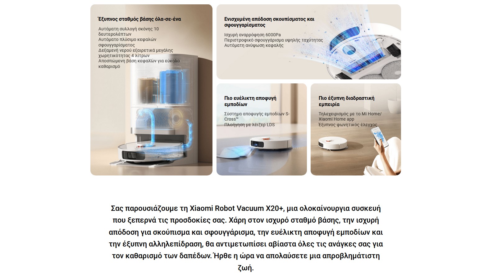 Σας παρουσιάζουμε τη Xiaomi Robot Vacuum X20+, μια ολοκαίνουργια συσκευή που ξεπερνά τις προσδοκίες σας. Χάρη στον ισχυρό σταθμό βάσης, την ισχυρή απόδοση για σκούπισμα και σφουγγάρισμα, την ευέλικτη αποφυγή εμποδίων και την έξυπνη αλληλεπίδραση, θα αντιμετωπίσει αβίαστα όλες τις ανάγκες σας για τον καθαρισμό των δαπέδων. Ήρθε η ώρα να απολαύσετε μια απροβλημάτιστη ζωή.